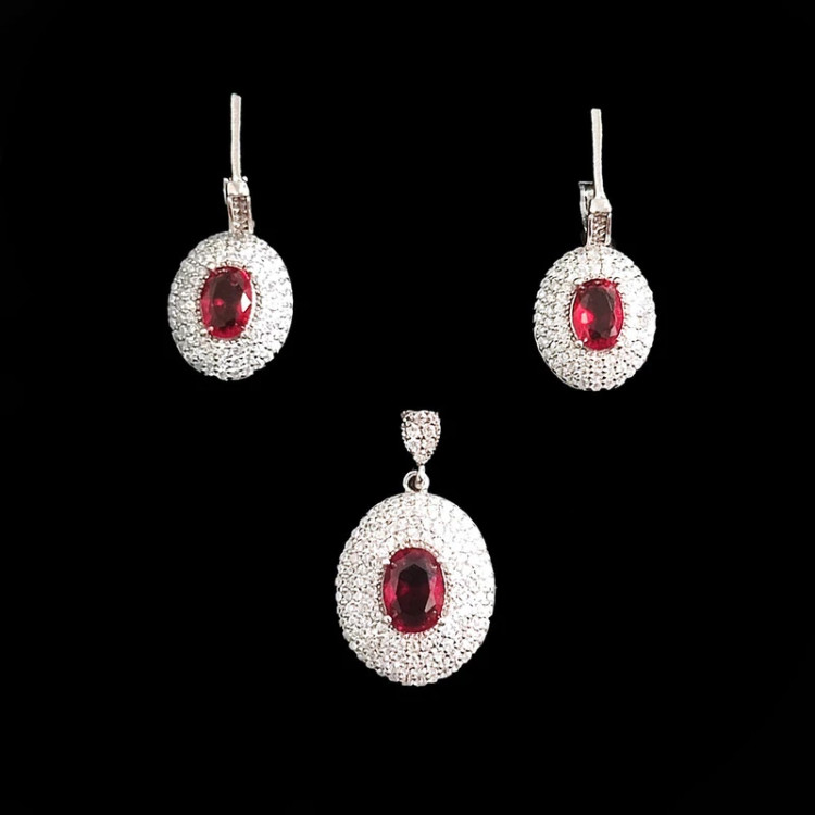 این نیم ست با نقره عیار 925 بالاترین عیار جواهرات و تزیینات نقره ساخته شده است. که با جدیدترین و بروزترین طراحی و مطابق با سلیقه بانوان اصیل و شیک پوش ایرانی ساخته شده و در طراحی آن تلفیقی از هنر کلاسیک و مدرن جواهرات بکار رفته است.پلاک وگوشواره های آن طرح جواهری باقالب طلا و نگین های قرمز سنتیتیک میباشد اطراف نگین اصلی نگین های اتمی بسیار زیبا و حرفه ای کار شده است که درخشندگی و جلوه خاصی به کار بخشیده است.این کار بدون زنجیر میباشد
