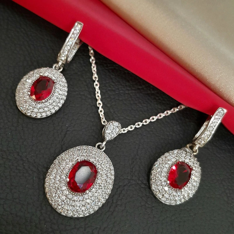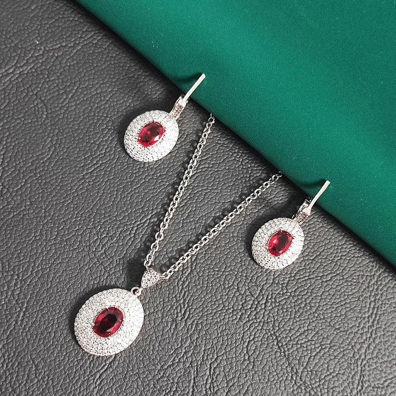 این نیم ست با نقره عیار 925 بالاترین عیار جواهرات و تزیینات نقره ساخته شده است. که با جدیدترین و بروزترین طراحی و مطابق با سلیقه بانوان اصیل و شیک پوش ایرانی ساخته شده و در طراحی آن تلفیقی از هنر کلاسیک و مدرن جواهرات بکار رفته است.پلاک وگوشواره های آن طرح جواهری باقالب طلا و نگین های قرمز سنتیتیک میباشد اطراف نگین اصلی نگین های اتمی بسیار زیبا و حرفه ای کار شده است که درخشندگی و جلوه خاصی به کار بخشیده است.این کار بدون زنجیر میباشد