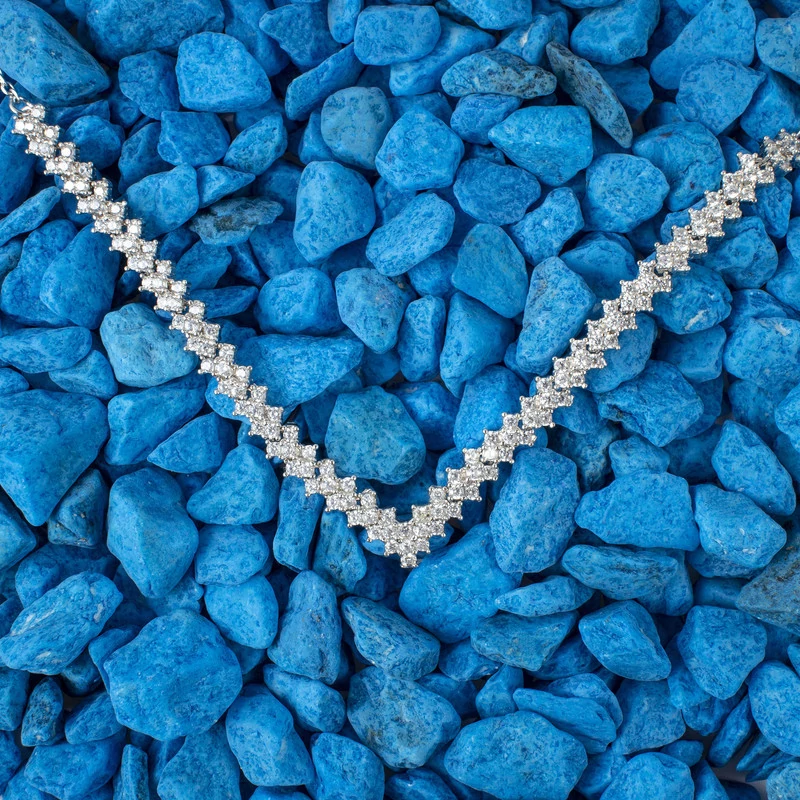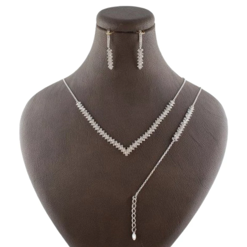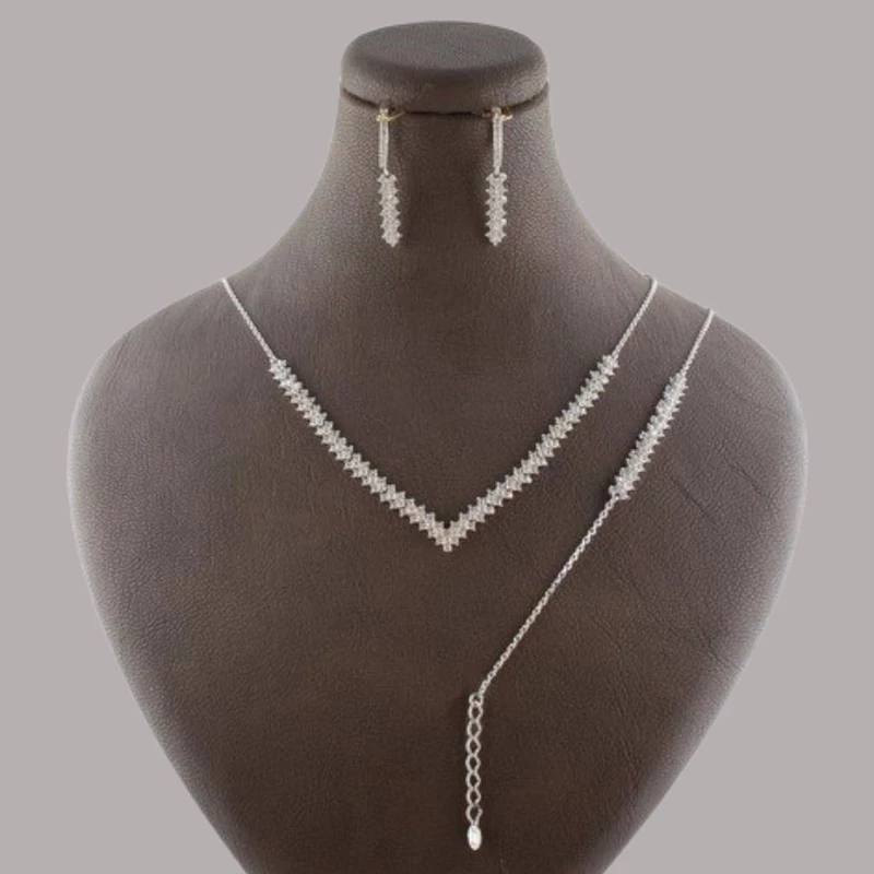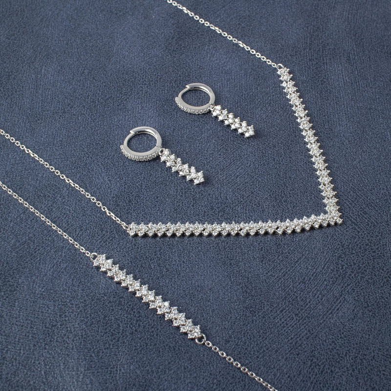 ست نقره زنانه به عیار 925 ،دارای روکش طلاسفید(رادیوم)می باشد،نگین های بکار رفته برلیان اتمی از جنس زیرکونیوم می باشند،کیفیت ساخت کار بسیار بالا بوده و در روکش آن از مواد حساسیت زا مانند نیکل استفاده نشده است،روکش طلاسفید و جلوه زیبا و درخشان کار باعث شده از نظر ظاهری تفاوتی با طلا نداشته باشد. نگین ها به روش میکروستینگ مخراج کاری شده اند و در برابر ضربه مقاوم هستند با این حال جهت جلوگیری از آسیب فیزیکی به کالا باید در برابر ورود ضربه شدید و تماس با مواد شیمیایی محافظت گردد.
