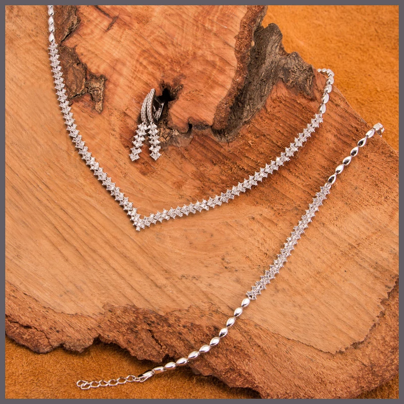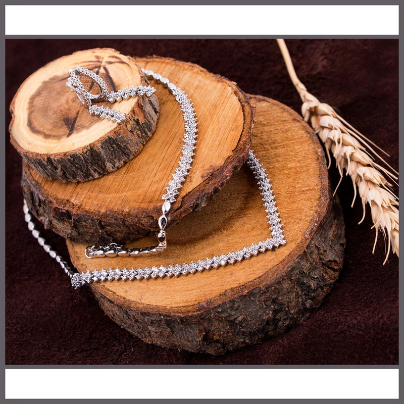نگینها زیر کونیااتمی با درخشش 3A می باشد که دارای درخشش بیشتری است دارای ابکاری رودیوم 5 لایه می باشد که از سیاه شدن بدنه جلوگیری میکند کلیه محصولات زیورالات از عیار 925 است .وزن کالا30.97 میباشد.