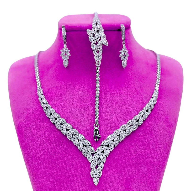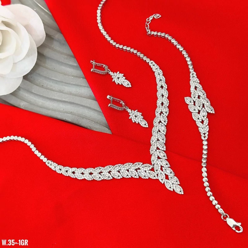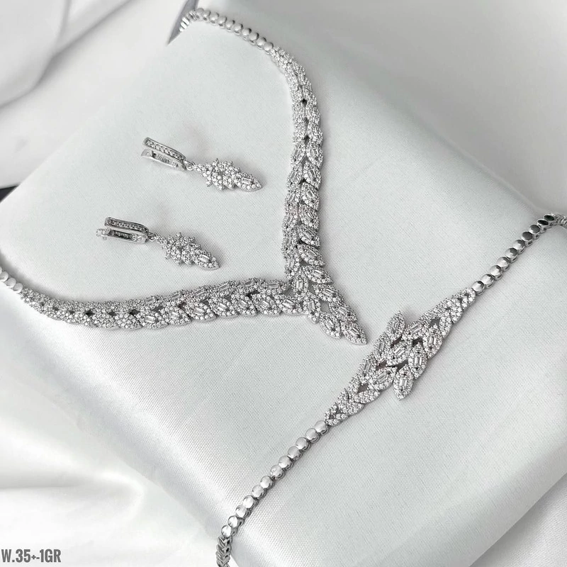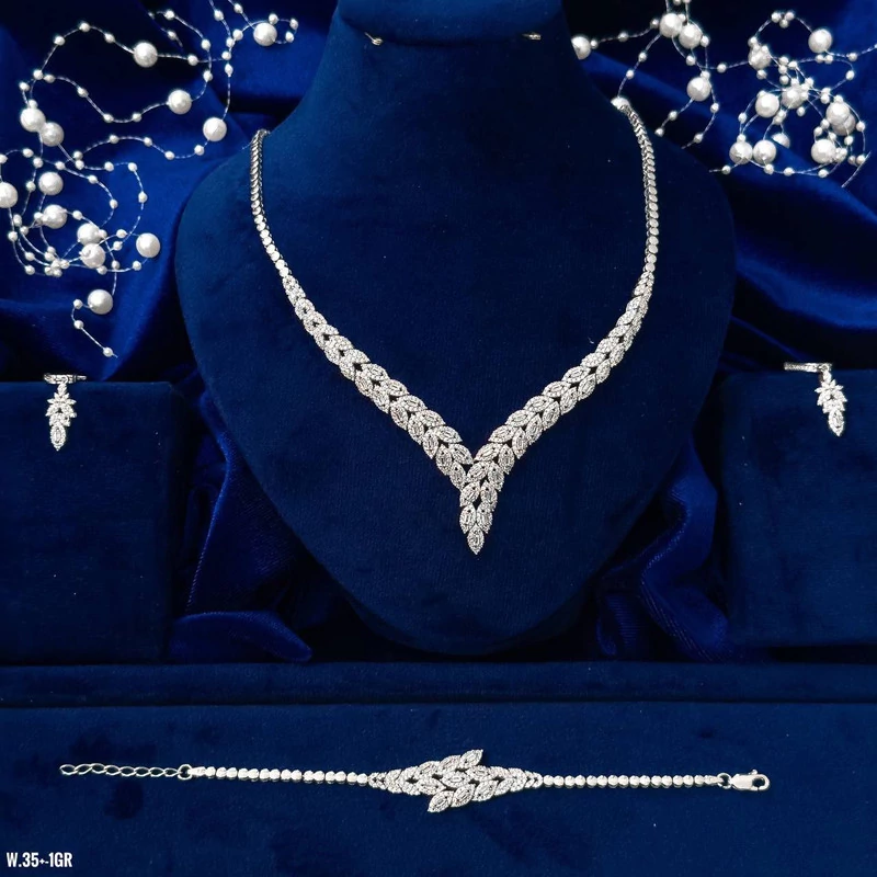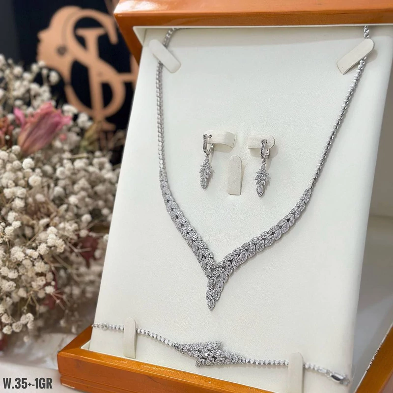 نیم ست نقره زنانه مجلسی جواهری یکی از زیباترین و پرطرفدارترین سرویس های نقره مجلسی است. خریداران عزیز دقت فرمایید که محصول خریداری شده فقط با بسته بندی موجود در سایت ارسال میشود این محصول با آب رودیوم به منظور محافظت و جلا و درخشندگی بیشتر پوشانیده که به آن جلوه جواهرگونه می دهد و پوست باعث حساسیت نمی شود. نگین های این محصول برلیان و باگت اتمی درجه یک بوده هستند. وزن درج شده در سایت حدودی بوده و + - 2 گرم در نظر برای تمامی محصولات مد نظر داشته باشین