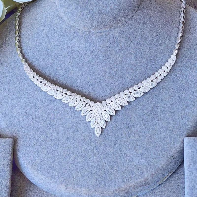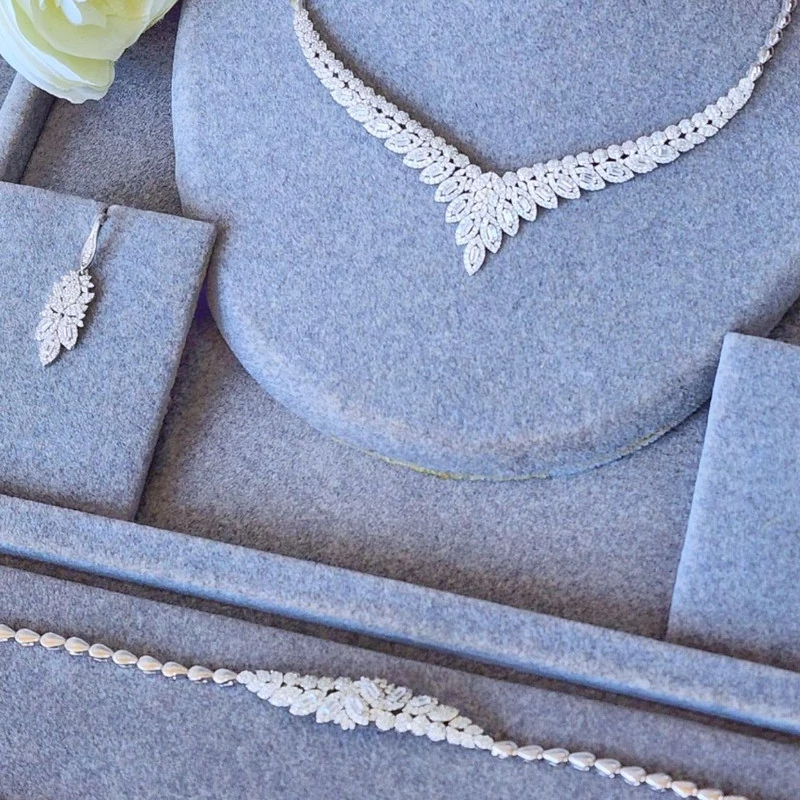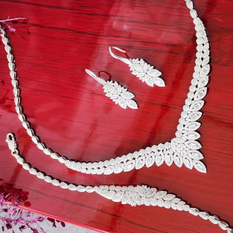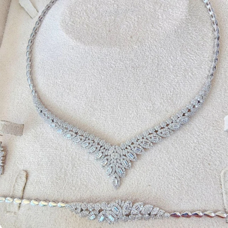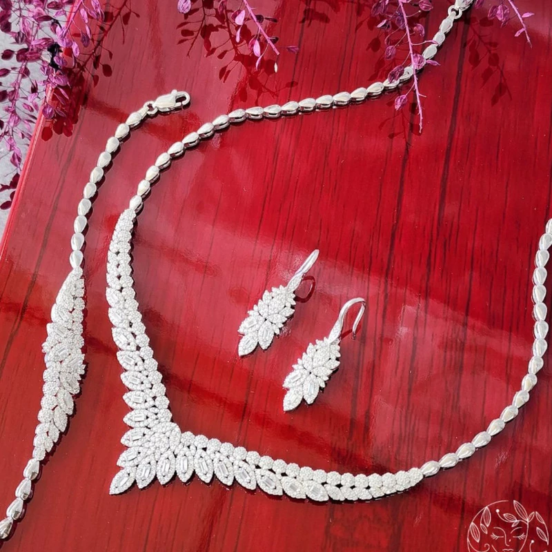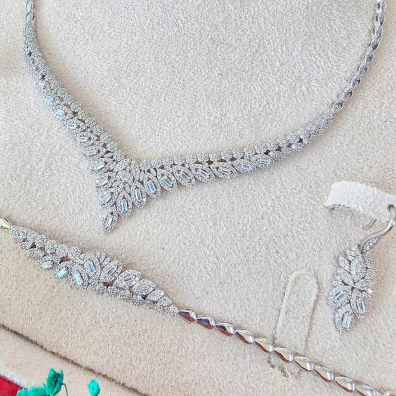 سرویس نقره زنانه مجلسی جواهری یکی از زیباترین و پرطرفدارترین سرویس های نقره مجلسی است. خریداران عزیز دقت فرمایید که محصول خریداری شده فقط با بسته بندی موجود در سایت ارسال میشود این محصول با آب رودیوم به منظور محافظت و جلا و درخشندگی بیشتر پوشانیده که به آن جلوه جواهرگونه می دهد و پوست باعث حساسیت نمی شود. نگین های این محصول برلیان و باگت اتمی درجه یک بوده هستند.