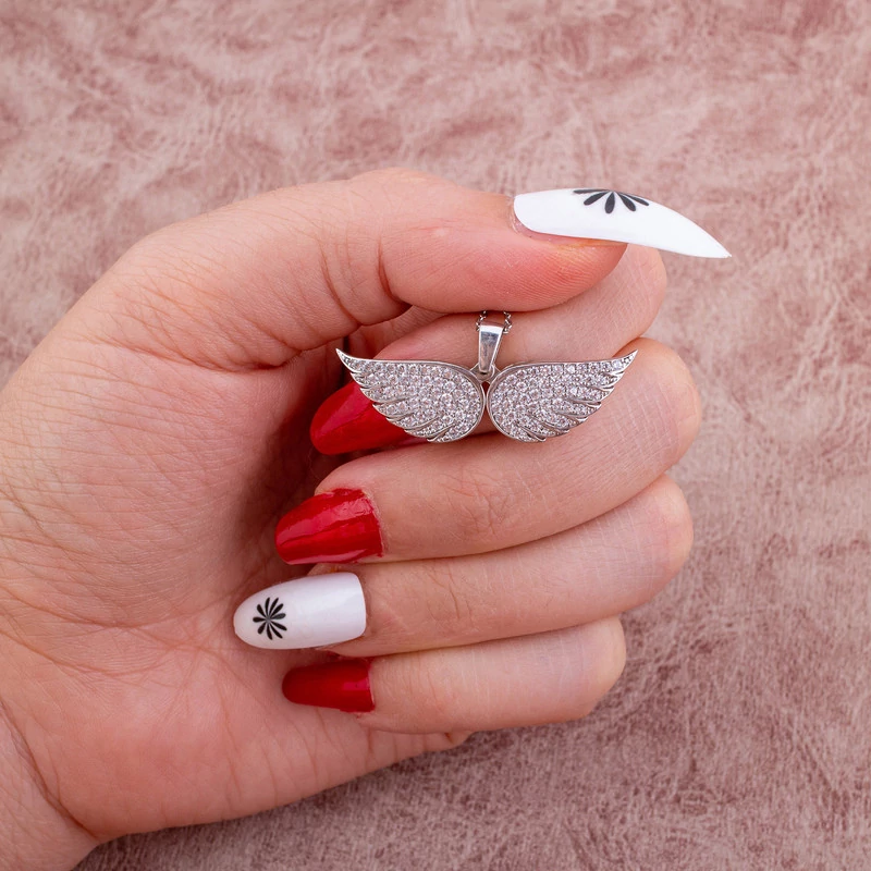 نیم ست نقره مدل بال فرشته به عیار 925 دارای روکش رادیوم(طلاسفید) می باشد،سنگهای برلیان اتمی از جنس زیرکونیا در سطح بیرونی کار مخراج کاری شده اند که جلوه ویژه ای به کار بخشیده است ،وزن نیمست حدود 6.6 گرم می باشد،کیفیت ساخت کار بسیار بالا بوده و در روکش آن از مواد حساسیت زا مانند نیکل استفاده نشده است،روکش طلاسفید و جلوه زیبا و درخشان کار باعث شده از نظر ظاهری تفاوتی با طلا نداشته باشد. نگین ها به روش میکروستینگ مخراج کاری شده اند و در برابر ضربه مقاوم هستند با این حال جهت جلوگیری از آسیب فیزیکی به کالا باید در برابر ورود ضربه شدید و تماس با مواد شیمیایی محافظت گردد.