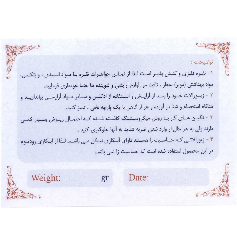 سایر توضیحات: نقره از جمله کم یاب ترین و ارزشمند ترین فلزات دنیاست ،وزن کالا به طور تقریبی 2.6 گرم قید شده است و ممکن است وزن کالای ارسالی برای شما تا 0.2 گرم کم تر یا بیشتر باشد ، خواهشمند است هنگام خرید با مشاهده تمام عکسهای موجود در آلبوم ومطالعه مشخصات ، ابعاد و جزئیات کالا را از زوایای مختلف بررسی کنید،کالا همراه با جعبه اصلی آمیتیس برای خریدار ارسال می شود