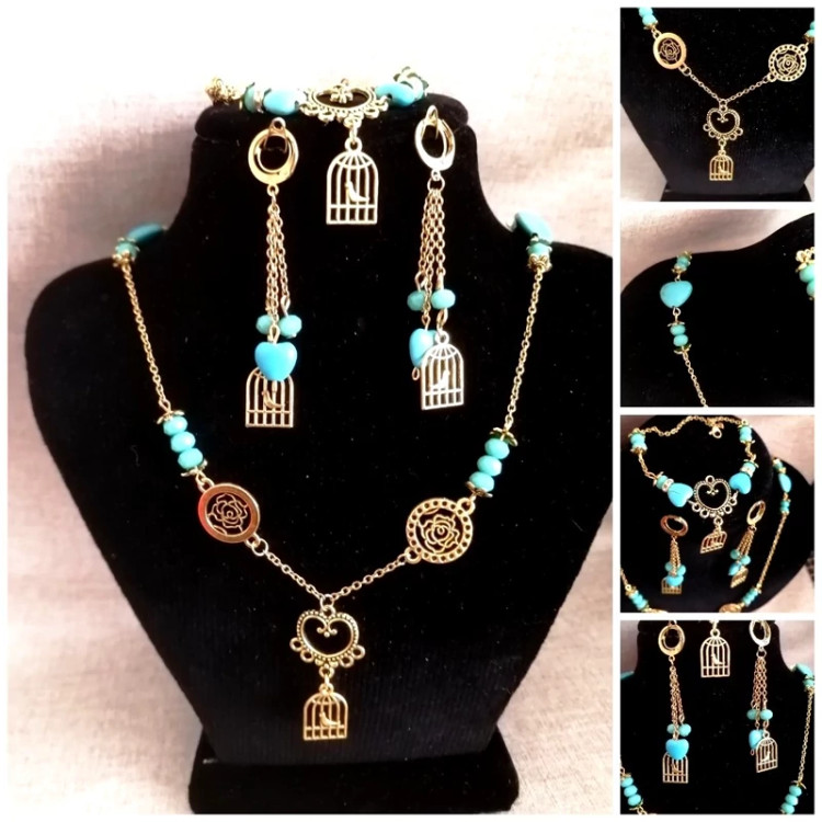 سرویس مرغ آمین با سنگهای فیروزه همراه لحظه های خوبتان، سنگها در رنگهای دلخواه قابل سفارش هستند، رنجیرها و بستها کاملا استیل و رنگ ثابت هستن.