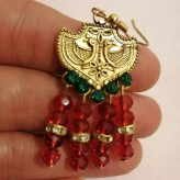 گوشواره از قاب برنز با طرح دو مرغ اسلیمی درست شده با نگین سبزو مهره کریستال قرمز