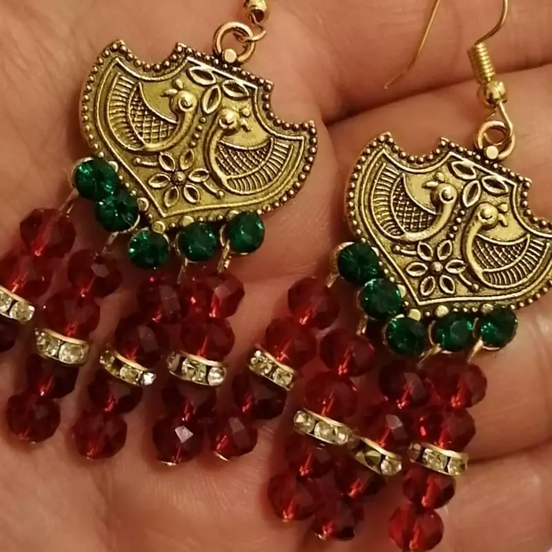 گوشواره از قاب برنز با طرح دو مرغ اسلیمی درست شده با نگین سبزو مهره کریستال قرمز