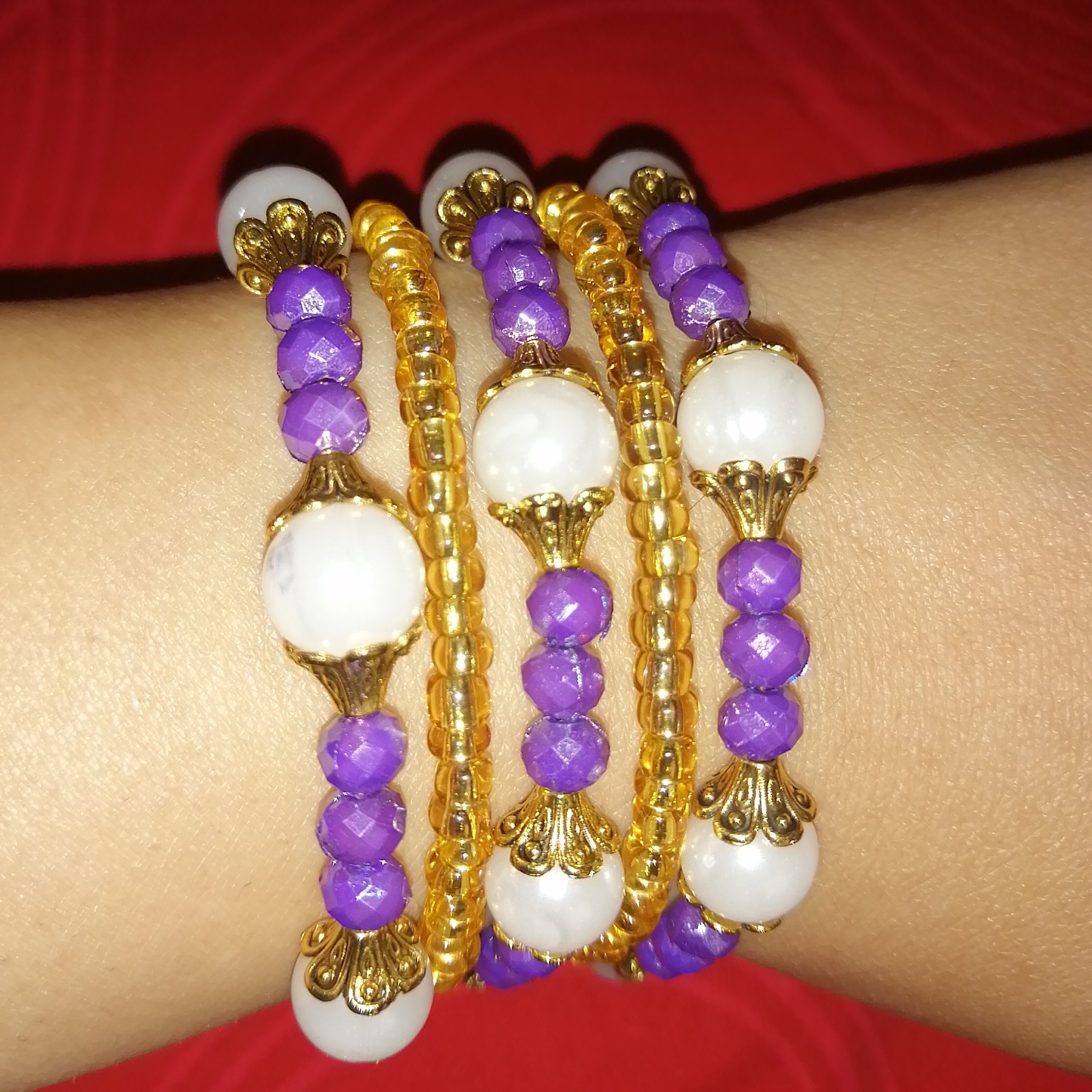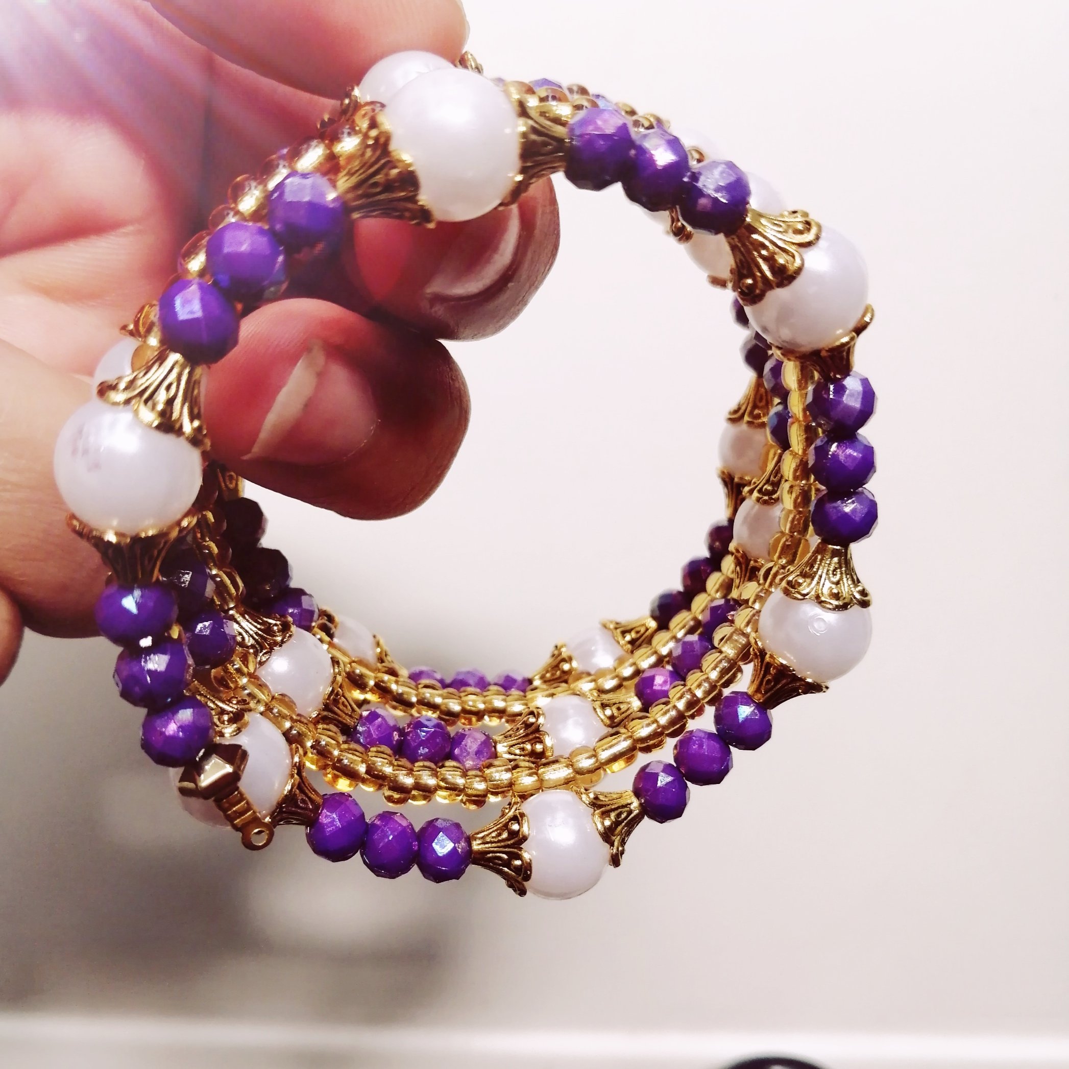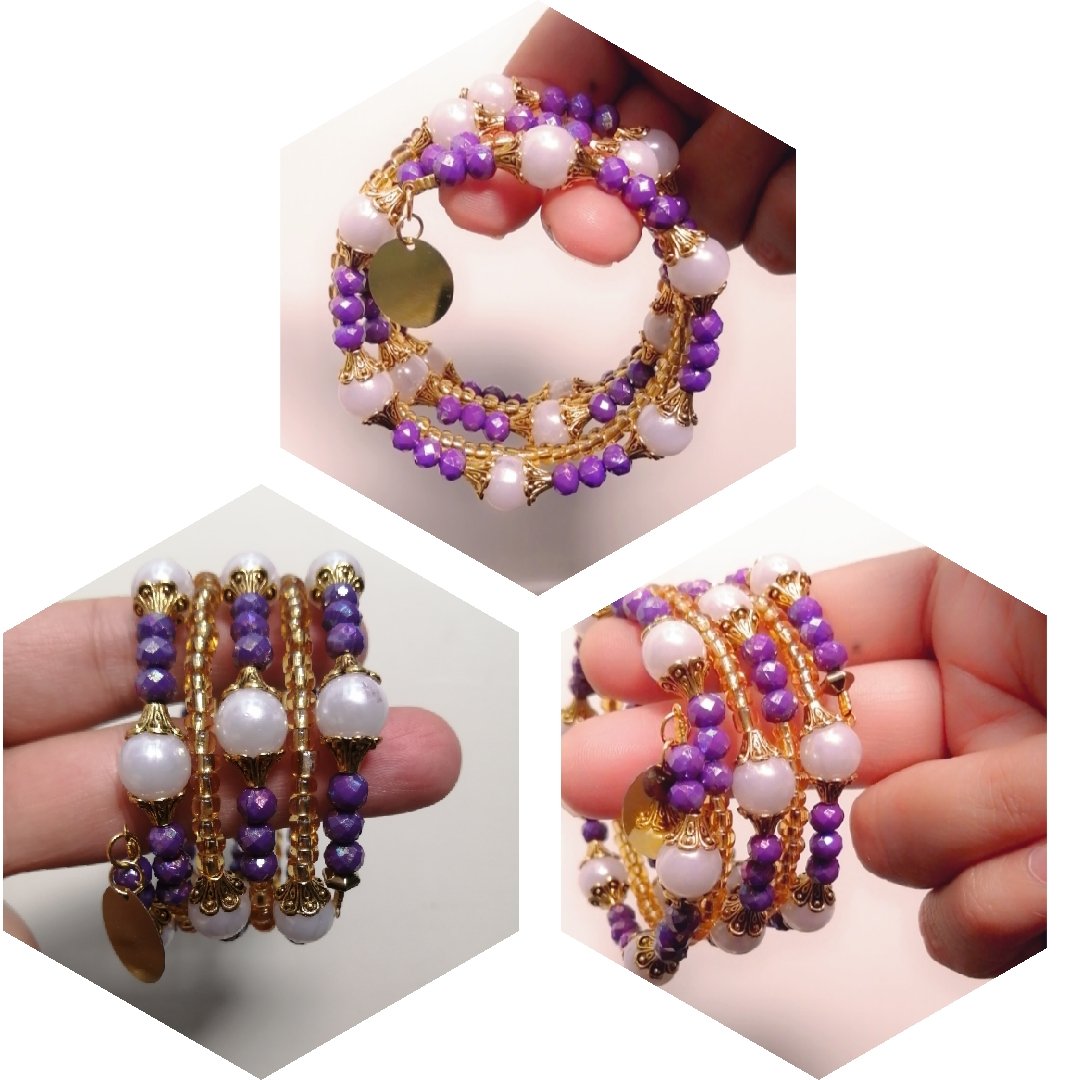 دستبند فنری سنگ بنفش از سنگ بنفش و مونجوق طلایی شیشه ای عالی تهیه شده است