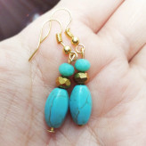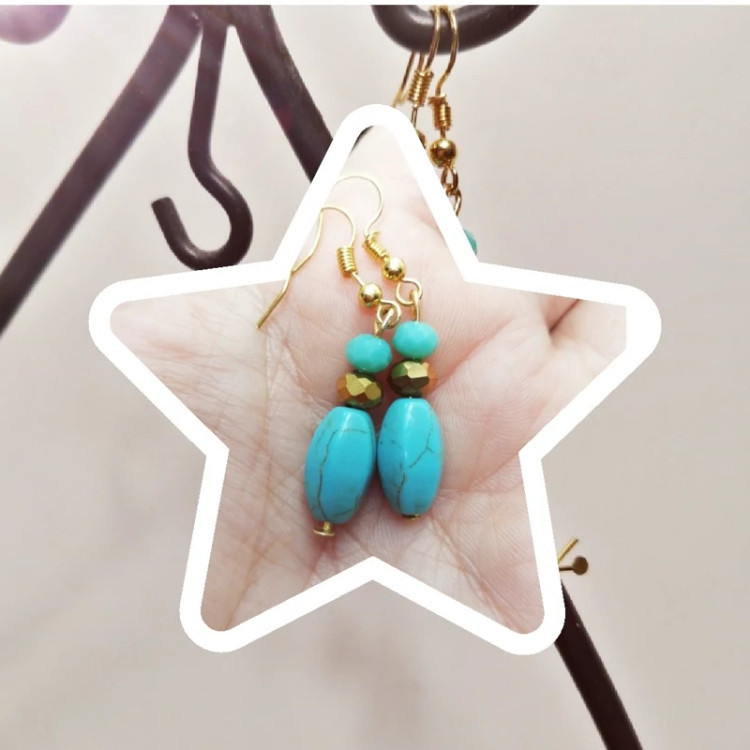 گوشواره فیروزه از سنگ فیروزه ای و مهره کریستال طلایی تشکیل شده است و کاملا رنگ ثابت هست چون باکس گوشواره استیل رنگ ثابت هست