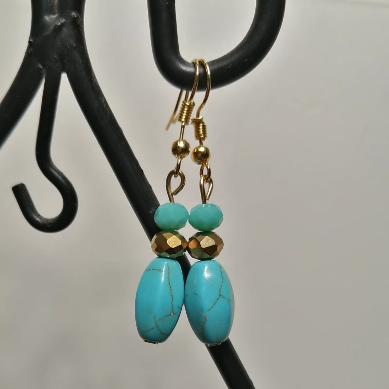 گوشواره فیروزه از سنگ فیروزه ای و مهره کریستال طلایی تشکیل شده است و کاملا رنگ ثابت هست چون باکس گوشواره استیل رنگ ثابت هست