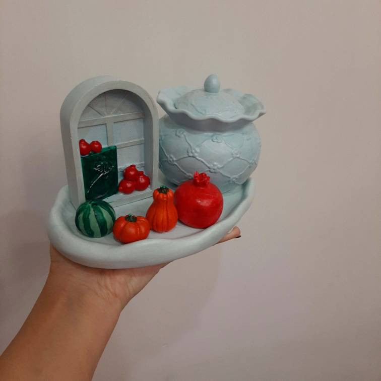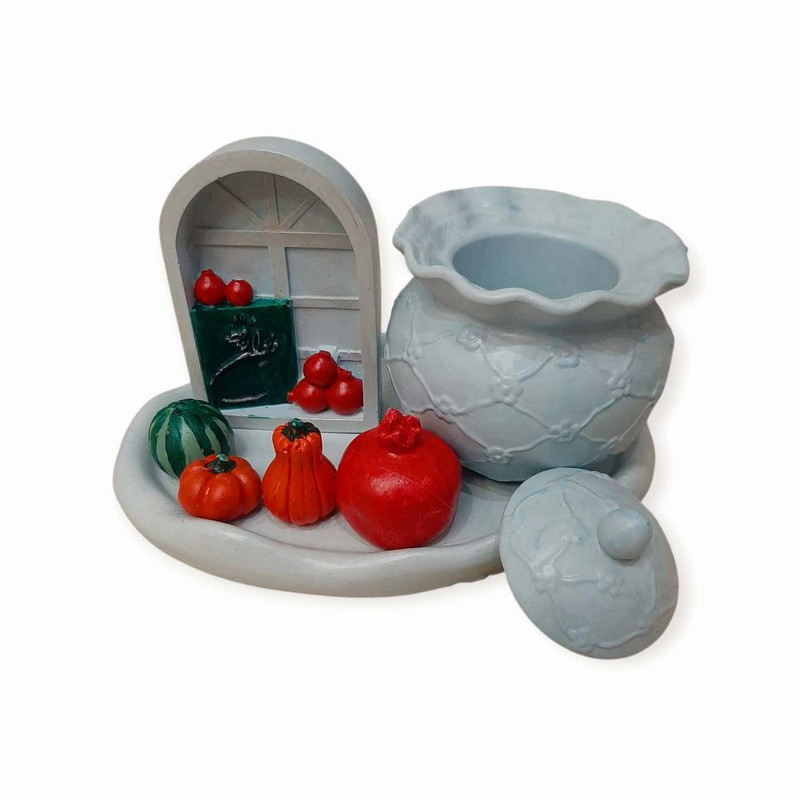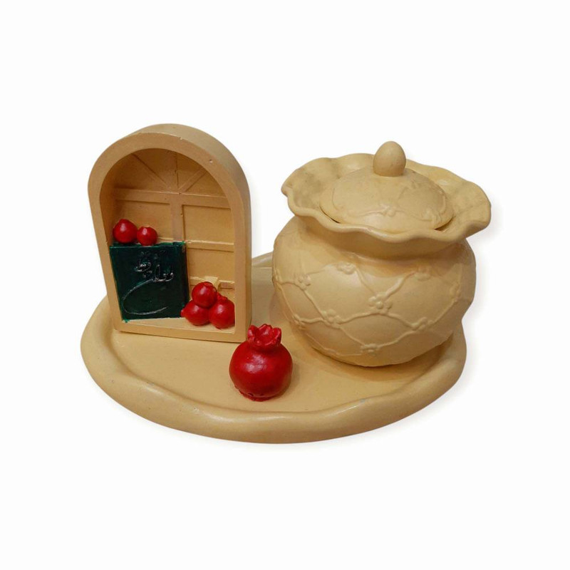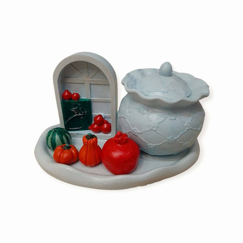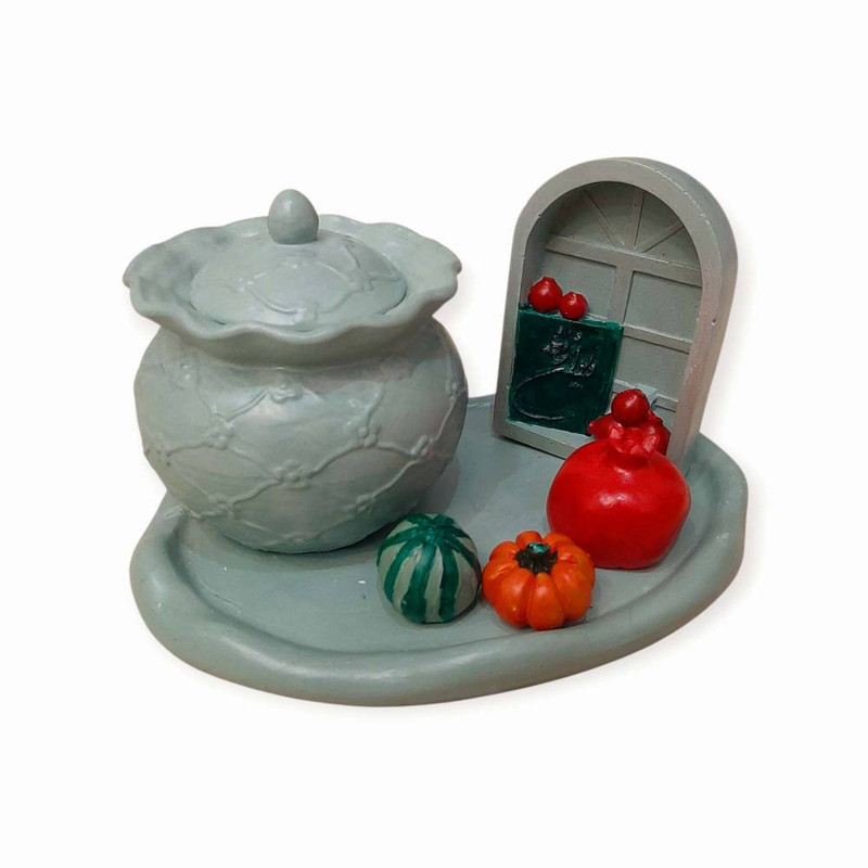 سینی سنگی حاوی مجسمه کتیبه یلدایی و بانکه طرح گل لوتوس،سینی سنگی تزئینی میباشد.