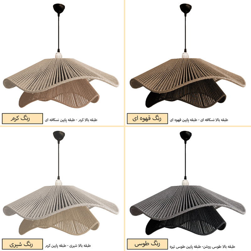 لوستر مکرومه دفرمه دو طبقه با فرم ازاد خود میتواند نشانگر سبک مدرن باشد. این محصول به همراه رول بولت سقفی ، ترمینال فشاری ، کفی لوستر ، پاتروم و 50 سانت سیم که میتوانید در ارتفاع مورد نظر نصب کنید عرضه میگردد . برای انتخاب رنگ لوستر مورد نظر خود لطفا عکس ها را ورق بزنید.