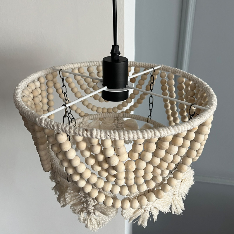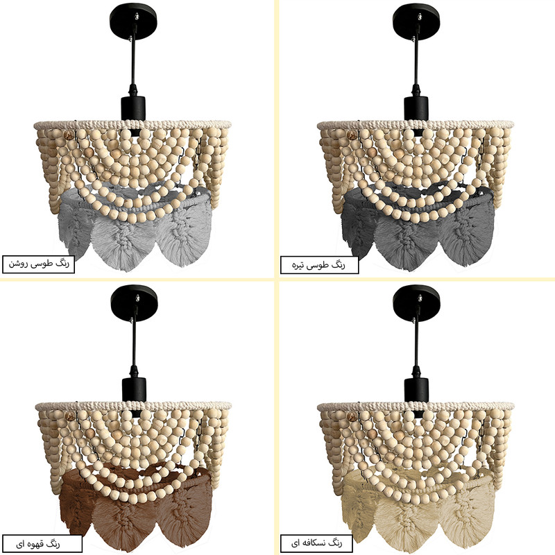 لوستر مهره چوبی نمایانگر سبک بوهو می باشد و به راحتی میتوانید با تمام اکسسوری های مکرومه ست کنید . این محصول از ساختار فلزی ، مهره های چوبی و برگهایی با نخ مکرومه ساخته شده است . انتخاب رنگ به معنای انتخاب رنگ نخ مکرومه می باشد و مهره های چوبی در هر حالت به صورت طبیعی و رنگ خود چوب ارسال میگردند .همچنین دارای کفی لوستر ، پاتروم ، سیم 50 سانت ، ترمینال فشاری(که دیگرنیازی به فازمتر نیست) و رول بولت سقفی نیز هست.