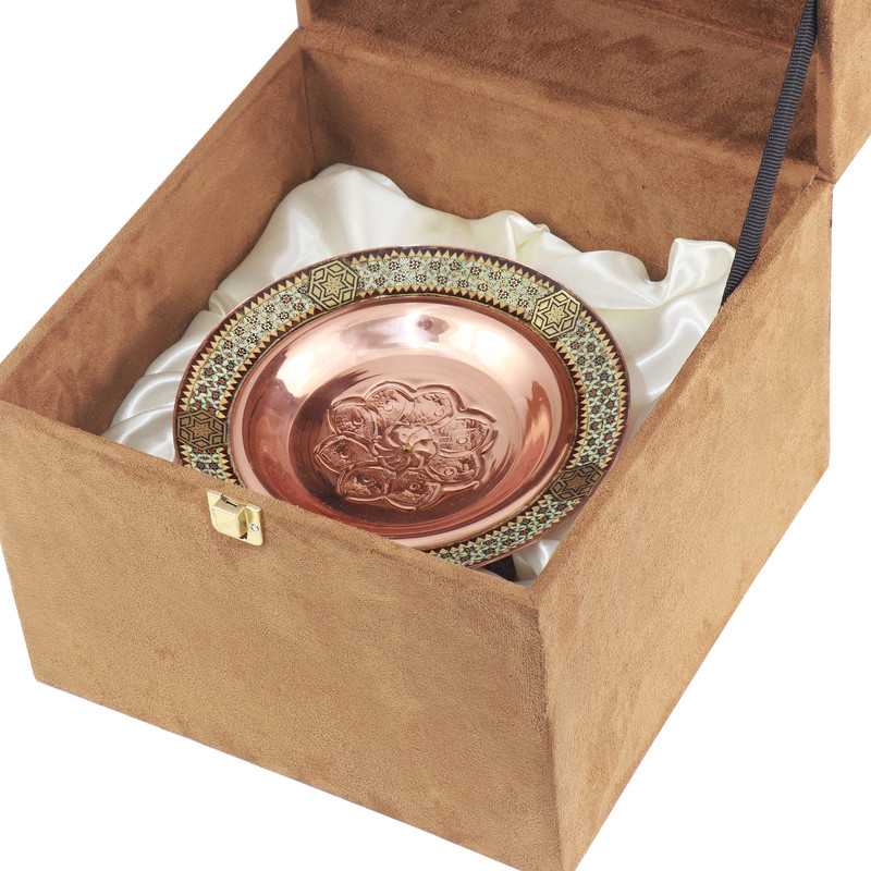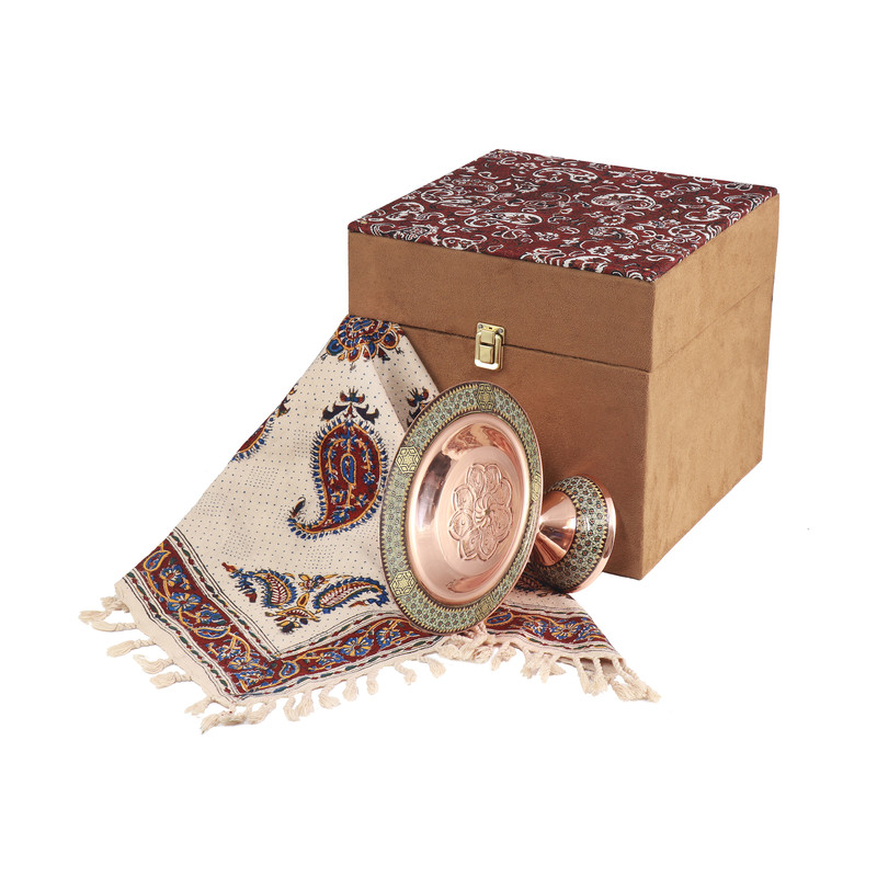 این ست شامل یک شیرینیخوری مس و خاتم در سایز قطر دهانه ۲۰ سانتیمتر و یک سفره قلمکار ساده با ابعاد ۶۰×۶۰ سانتیمتر است که با طراحی سنتی و کیفیت بالا، ترکیبی هنری و کاربردی را پدید آوردهاند.