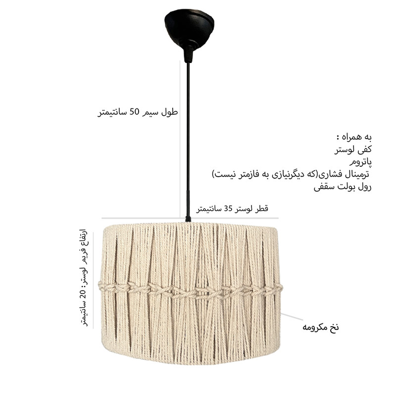 این محصول از فریم فلزی و نخ مکرومه تشکیل شده است. لوستر مکرومه مکروشی طرح پاپیون به همراه کفی لوستر ، رول بولت سقفی ، ترمنیال فشاری و سیم قابل تنظیم تا ارتفاع 50 سانتیمتر عرضه میگردد. برای انتخاب رنگ مورد نظر خود عکس ها را ورق بزنید.