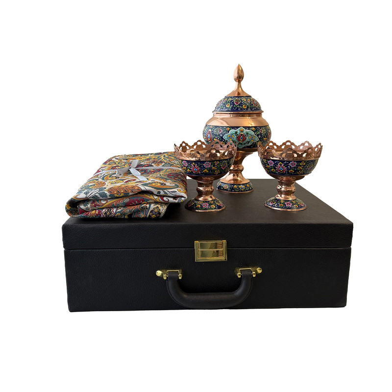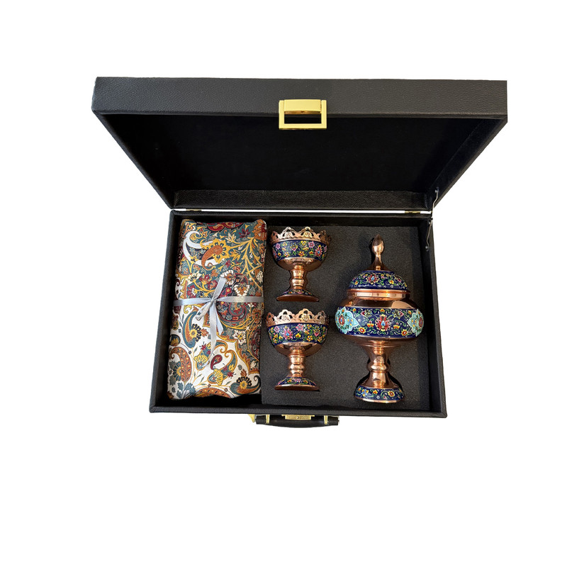 پک هدیه شکلاتخوری 2عدد آجیلخوری مسوپرداز همراه ترمه اعلاء، همانطور که در تصویر نمایان است، نمونهای کامل از اصالت، ظرافت و سلیقه است. این پک شامل: یک عدد شکلات خوری یا ارتفاع 24 سانت و دو عدد آجیل خوری با ارتفاع 12 سانت مس و پرداز و رومیزی ترمه نفیس در ابعاد یک در یک ارائه شده در جعبه چرم می باشد. تمام اجزای این پک، از شکلاتخوری تا آجیلخوریها و ترمه، با دقت و حساسیت بالا انتخاب شدهاند. تا یک هدیه لوکس و مناسب برای مناسبتهای خاص، مدیران، مهمانان ویژه یا عزیزانتان باشد. استفاده از رنگهای اصیل ایرانی، این اثر را نهتنها به یک وسیله کاربردی تبدیل میکند. پک شکلاتخوری 2عدد آجیلخوری مسوپرداز همراه ترمه اعلاء فقط یک ست تزئینی نیست؛ بلکه کاملاً کاربردی و قابل استفاده در زندگی روزمره یا مراسم رسمی است. شکلاتخوری و آجیلخوریها برای پذیرایی در مهمانیها و دورهمیهای خانوادگی یا جلسات رسمی بهترین انتخاب هستند. میتوانید برای سرو انواع شکلات، نقل، شیرینی، آجیل و حتی میوههای خشک از این ظروف استفاده کنید. وجود ترمه اعلاء نیز به سفره و میز شما جلوهای مجلل و سنتی میبخشد و میتواند به عنوان رومیزی یا رانر استفاده شود. پک هدیه شکلاتخوری 2عدد آجیلخوری مسوپرداز همراه ترمه اعلاء، یک انتخاب تمامعیار برای کسانی است که به دنبال هدیهای با ترکیب اصالت ایرانی، هنر ناب و زیبایی چشمگیر هستند. هر جزء این پک، روایتگر فرهنگ، تاریخ و ذوق مردم ایرانزمین است و میتواند لحظاتی ناب و بهیادماندنی برای عزیزان شما رقم بزند.