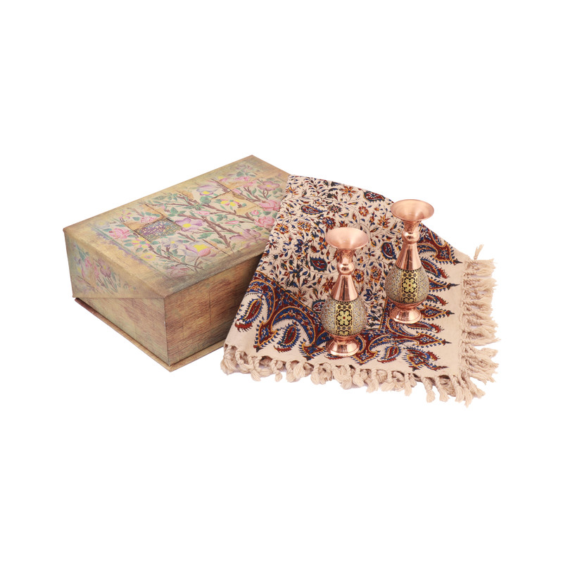 چکامه ۳ انتخابی هنرمندانه برای آنهاییست که به دنبال هدیهای خاص، ماندگار و با جلوهای کاملاً ایرانی هستند. این ست با ترکیب پارچه قلمکار و گلدانهای مس و خاتم، تجسمی از هنر اصیل ایرانی در قالبی شیک و کاربردی است.