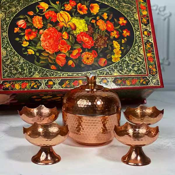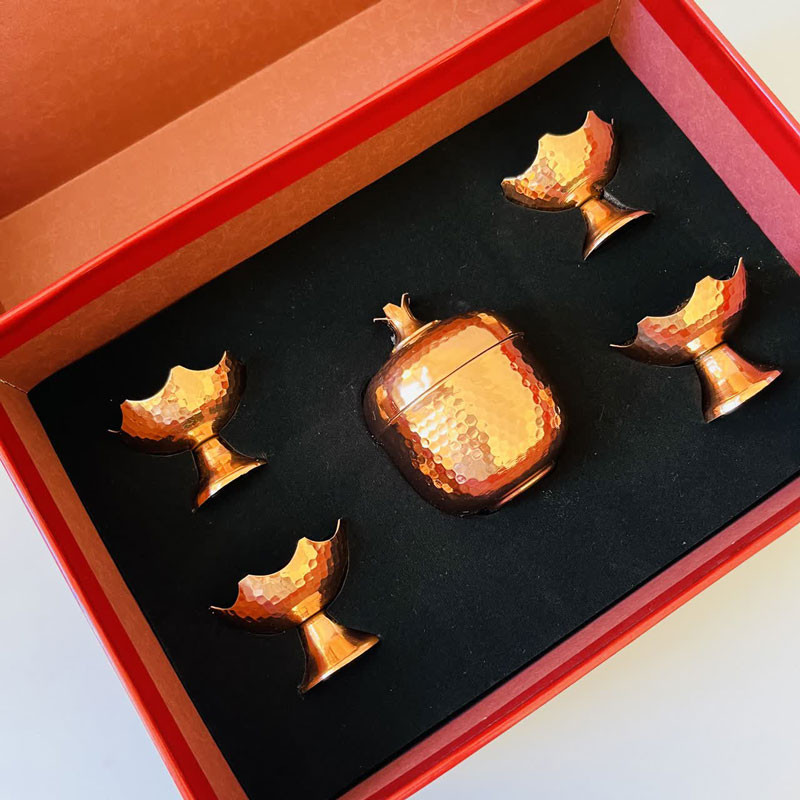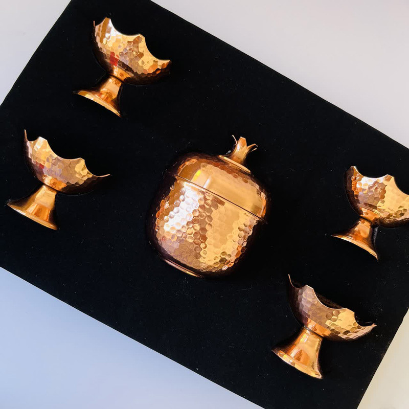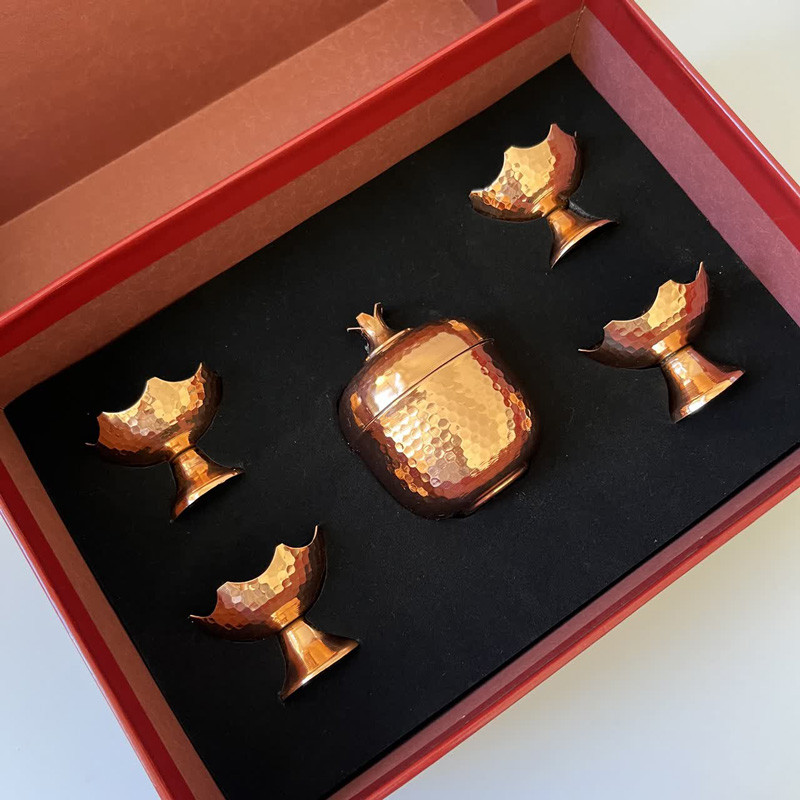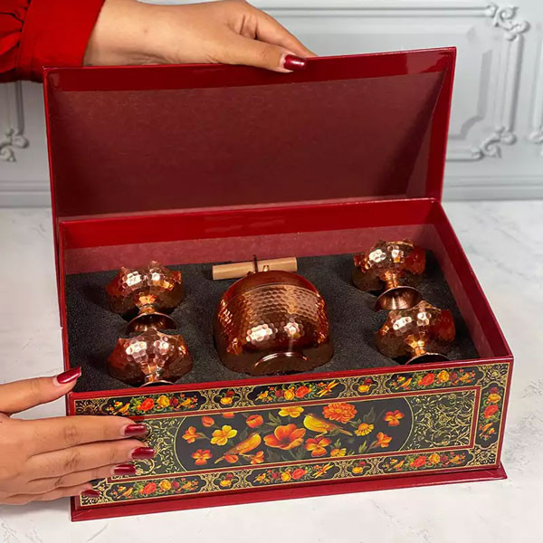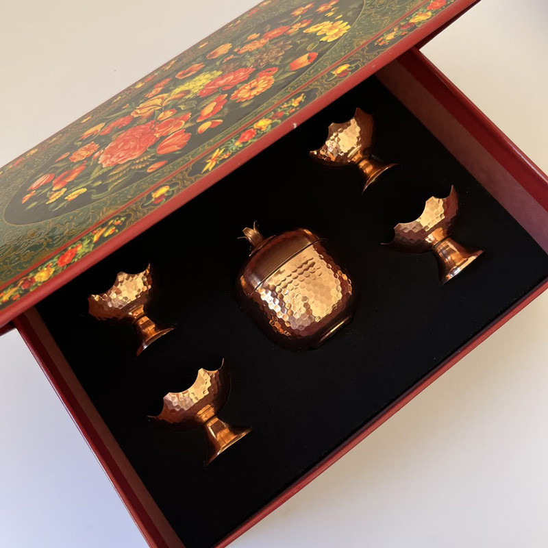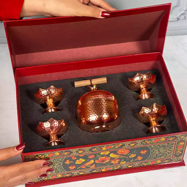 پک هدیه سازمانی شامل 4 پیاله کنگرهای تک پایه، یک ظرف مسی با طرح انار و فال حافظ، همراه با جعبه کادوی سازمانی با نقوش زیبای تذهیب ایرانی، انتخابی شایسته برای مدیران سازمان است. این پک با ترکیبی از هنر اصیل و طراحی خاص، پیامآور احترام و اصالت فرهنگی ایرانی است.ارتفاع پیاله آن حدود 5 سانتی متر و وزن آن 40 گرم و قطر آن حدود 6.5 سانتیمتر و ارتفاع ظرف طرح انار آن حدود 9 سانتی متر و وزن آن 120 گرم و قطر آن حدود 8 سانتیمتر می باشد.