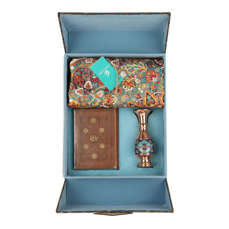 این ست هدیهی فاخر، ترکیبی هنرمندانه از گلدان مس و پرداز، رومیزی ترمهی اصیل و دیوان نفیس حافظ است؛ مجموعهای که زیبایی، فرهنگ و هنر ایرانی را به شکلی چشمنواز در کنار هم قرار داده است.