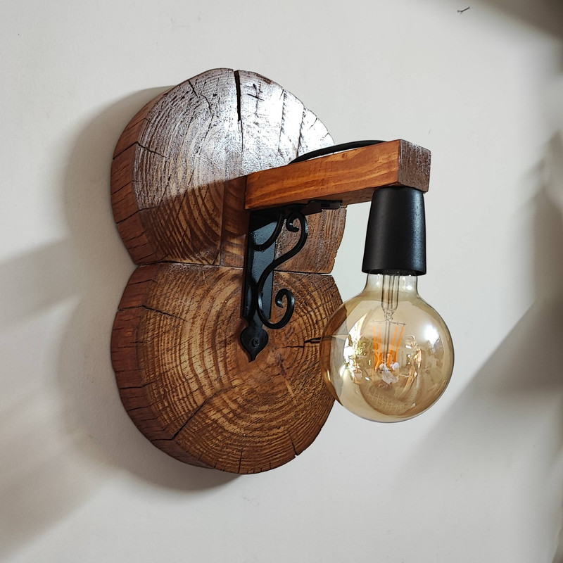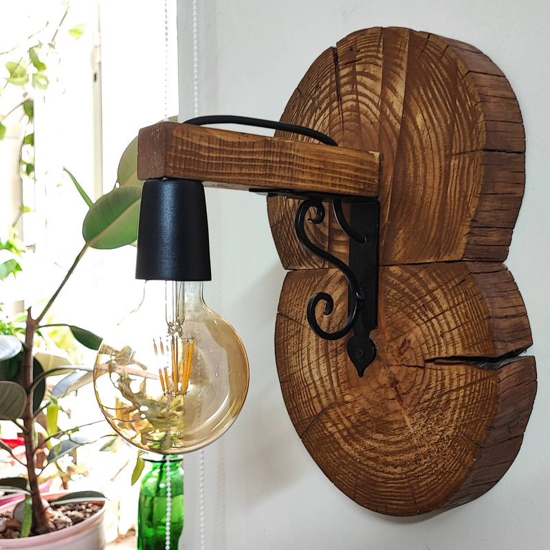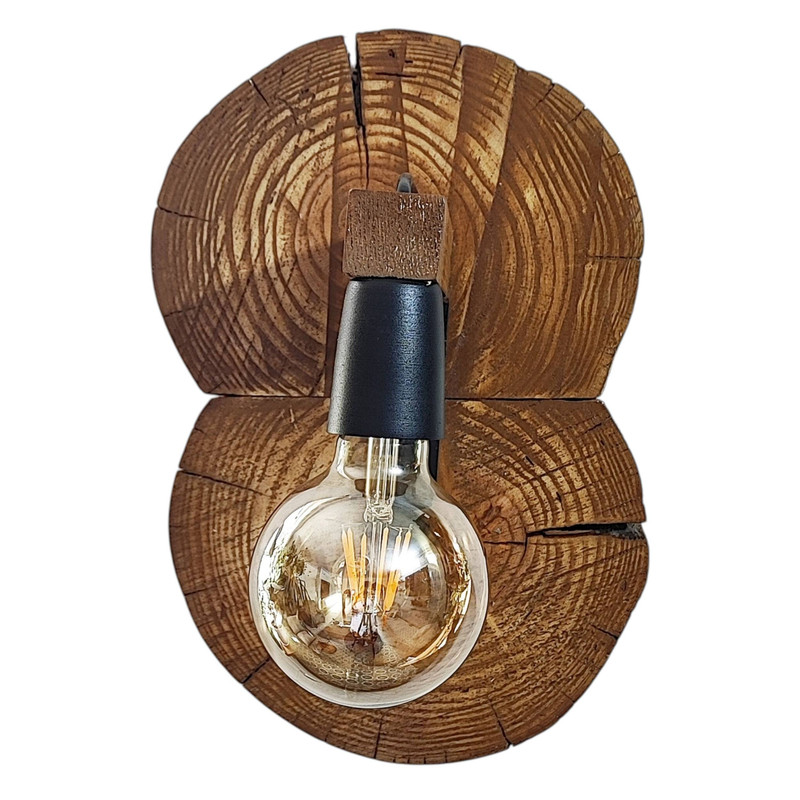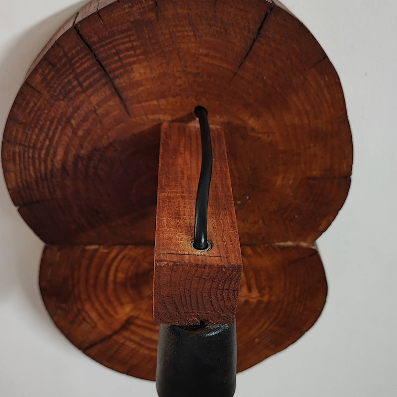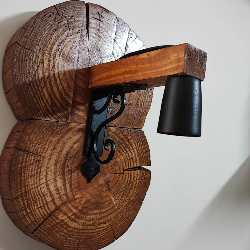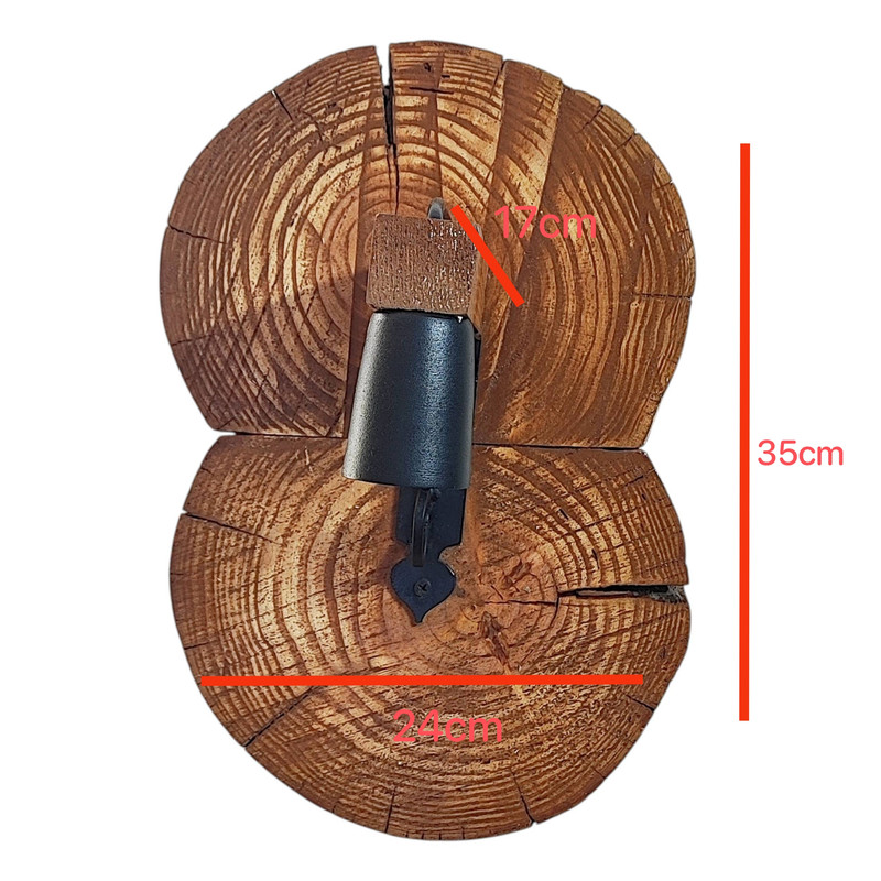 چراغ دیواری از چوب درخت کاج با ضخامت 40سانتیمتر با قرار گیری دو برش کالباسی در کنار هم ساخت شده است و دست ساز میباشد.