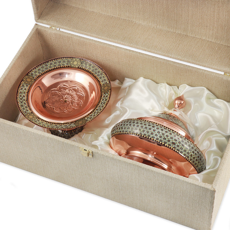 ست هدیه فروز ۲۰ جلوهای چشمنواز از صنایعدستی اصیل ایرانی است که با طراحی هماهنگ و کیفیتی ماندگار، انتخابی شایسته برای هدیه در مناسبتهای خاص به شمار میرود. این مجموعه شامل یک قندان سفینهای مس و خاتم سایز ۳ بههمراه یک شیرینیخوری مس و خاتم با قطر دهانه ۲۰ سانتیمتر و یک سفره قلمکار ساده 80×80 سانتی متر میباشد.