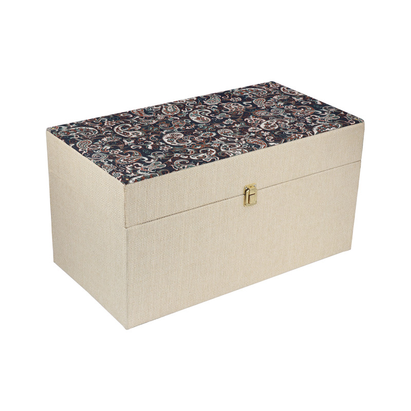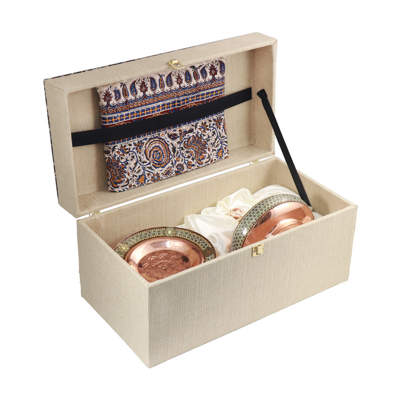 اقلام این ست با دقت و نظم درون جعبهای از جنس مخمل با روکشی از ترمه و در ابعاد ۵۰×۲۵×۲۵ سانتیمتر قرار گرفتهاند. استفاده از طراحی شیک و فوم محافظ داخلی، ضمن حفظ زیبایی ظاهری، ایمنی در حمل و نگهداری را نیز تضمین میکند.