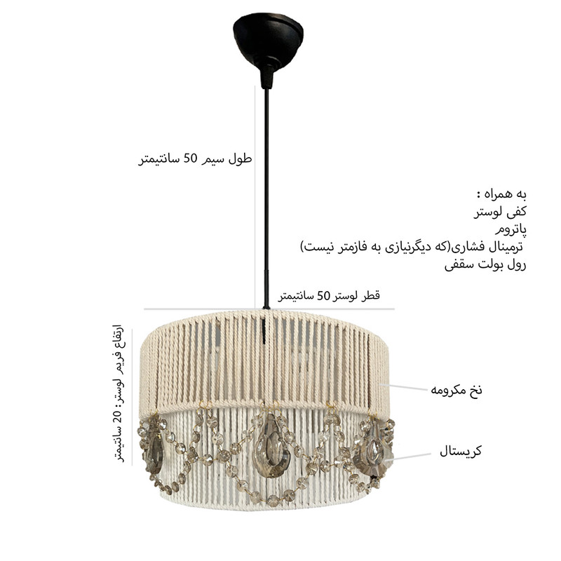 لوستر مکرومه دو طبقه با اویز های خاص کریستال به صورت دست ساز تهیه میگردد . این محصول شامل سیم قابل تنظیم تا ارتفاع 50 سانتیمتر هست که به راحتی میتوانید در ارتفاع مورد نیاز خود نصب کنید . برای اطلاع از رنگبندی عکس ها را ورق بزنید.