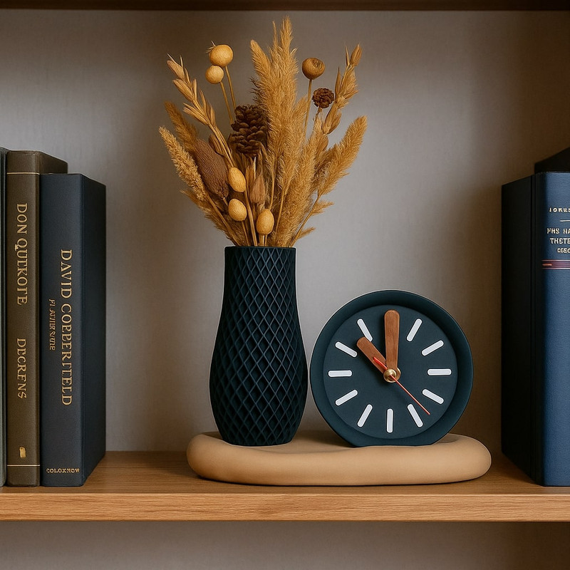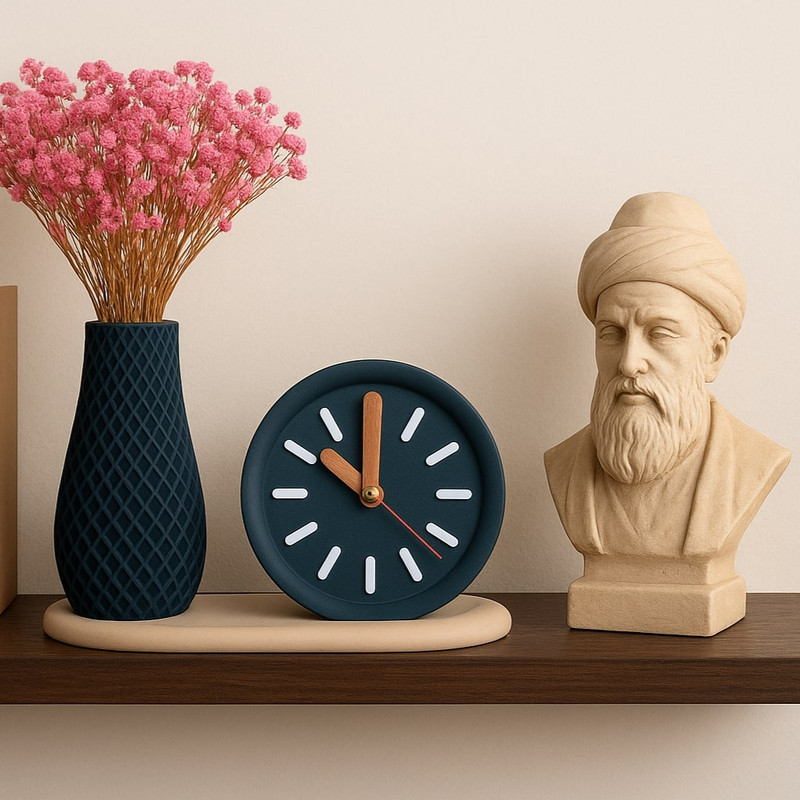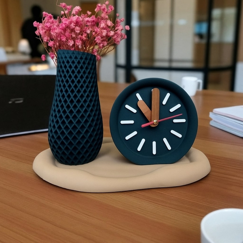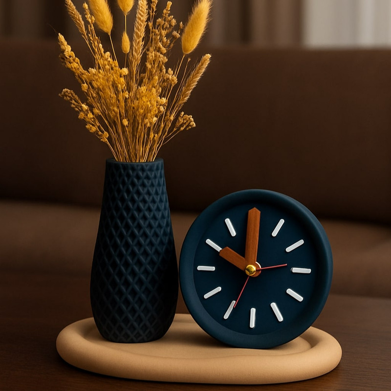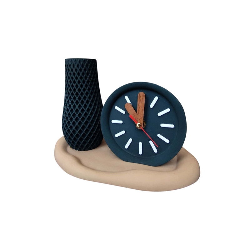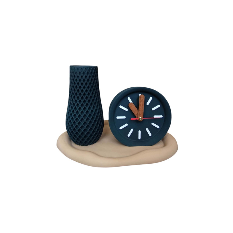 این محصول یک ست دکوری خاص و مدرن است که از بتن پلیمری یا همان بتن سبک ساخته شده و به دلیل جنس باکیفیت و مقاوم خود، علاوه بر زیبایی، دوام و استحکام بالایی نیز دارد. طراحی محصول به گونهای است که روی یک سینی با ابعاد ۲۴.۵ سانتیمتر طول و ۹.۸ سانتیمتر عرض قرار گرفته و ترکیب چشمنوازی از ساعت و گلدان را در کنار هم به نمایش میگذارد. ساعت این ست با قطر ۱۲ سانتیمتر طراحی شده و صفحهای ساده و مینیمال دارد که جلوهای مدرن به فضا میبخشد. در کنار ساعت، گلدانی به ارتفاع ۱۵ سانتیمتر قرار گرفته است که در عین سادگی، به زیبایی ست افزوده و ترکیب را کامل میکند. این ترکیب دکوری به دلیل ابعاد جمعوجور و طراحی کاربردی، انتخابی ایدهآل برای روی میز کار، شلفهای دکوری یا حتی میز جلو مبلی است و میتواند هم نقش کاربردی (به عنوان ساعت) و هم نقش تزئینی (به عنوان دکوری خاص) را بهطور همزمان ایفا کند. ترکیب رنگ سورمهای تیره با نسکافهای نیز در این محصول به کار رفته که یکی از هماهنگترین و شیکترین ترکیبها در دکوراسیون محسوب میشود چون سورمهای تیره حس عمق، آرامش و جدیت به فضا میبخشد و در مقابل نسکافهای با لطافت و گرمایی که دارد تعادل ایجاد میکند و باعث میشود فضا خشک و سرد به نظر نرسد و همین هارمونی رنگی جلوهای مدرن و در عین حال لوکس میآفریند و به دلیل تضاد ملایم میان تیرگی سورمهای و روشنی نسکافهای چشم را خسته نمیکند.