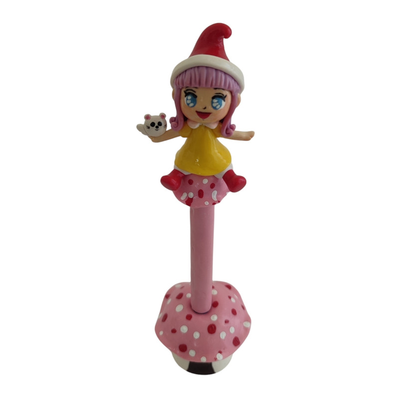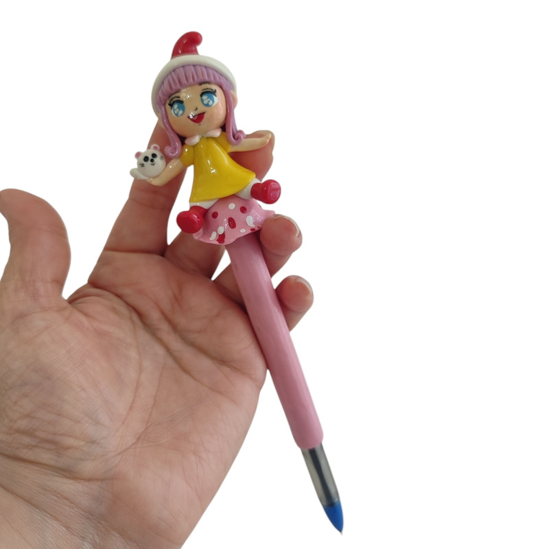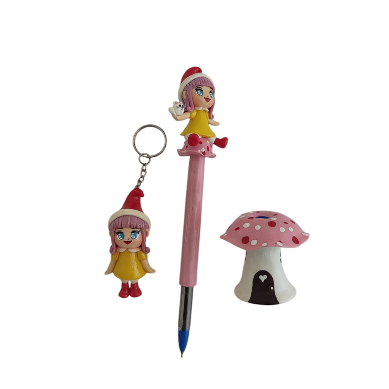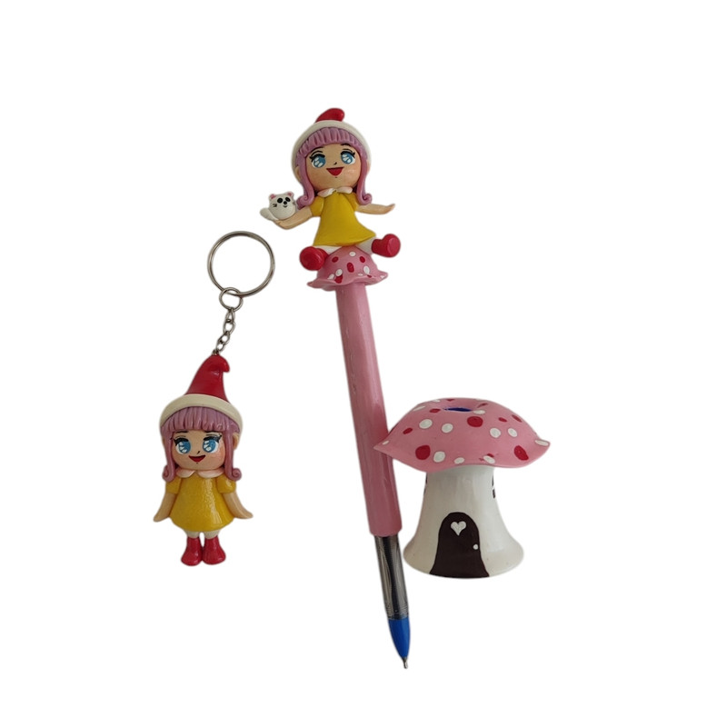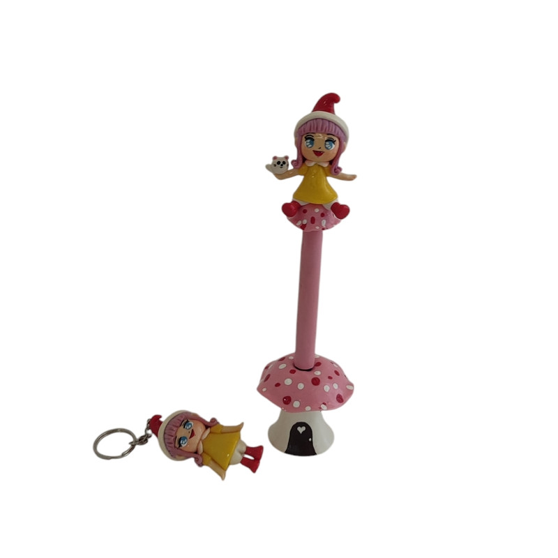 این کار یک عدد خودکار ممول و یک عدد جاکلیدی ممول با هم است و جنس کار خمیر ایتالیایی هوا خشک است و قابل شستشو است و کاملا دست ساز است و بدون قالب گیری ساخته شده و اندازه قد خودکار همراه پایه 20 سانتیمتر است و اندازه جاسوییچی بدون حلقه و زنجیر 7.5 سانتیمتر است و کار بسیار شیک و زیبایی است