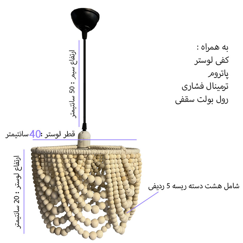 قطر لوستر 40 سانتیمتر و ارتفاع لوستر 20 سانتیمتر است. متریال های مصرفی شامل مهره چوبی ، سازه فلزی و نخ مکرومه میباشد . این محصول به همراه رول بولت سقفی ، 50 سانت سیم ، ترمینال فشاری ، پاتروم و کفی لوستر عرضه میگردد.