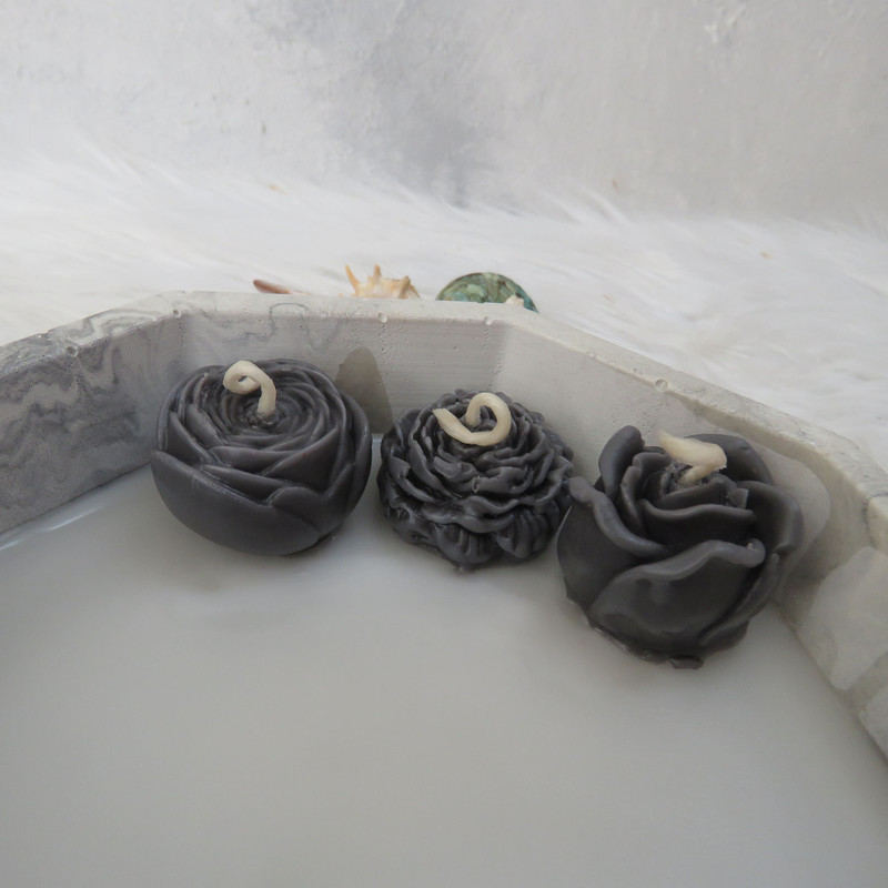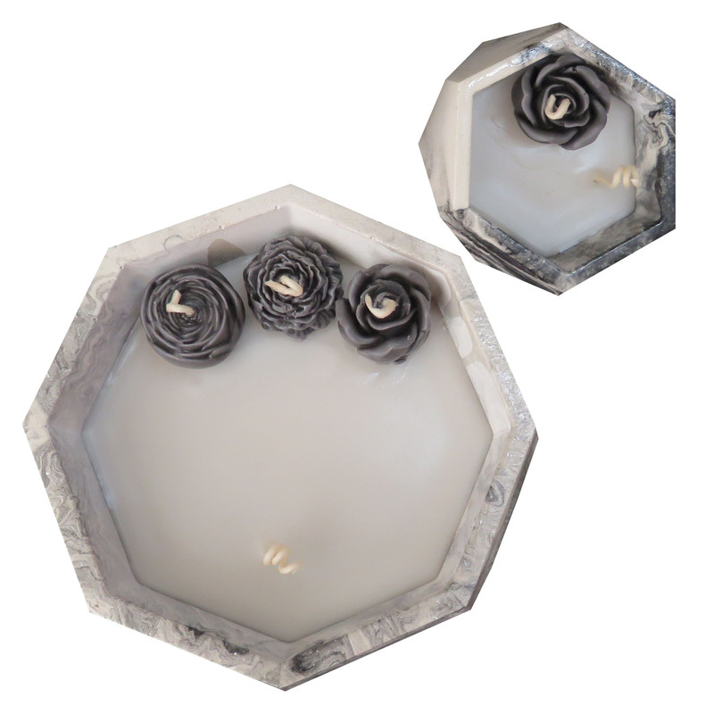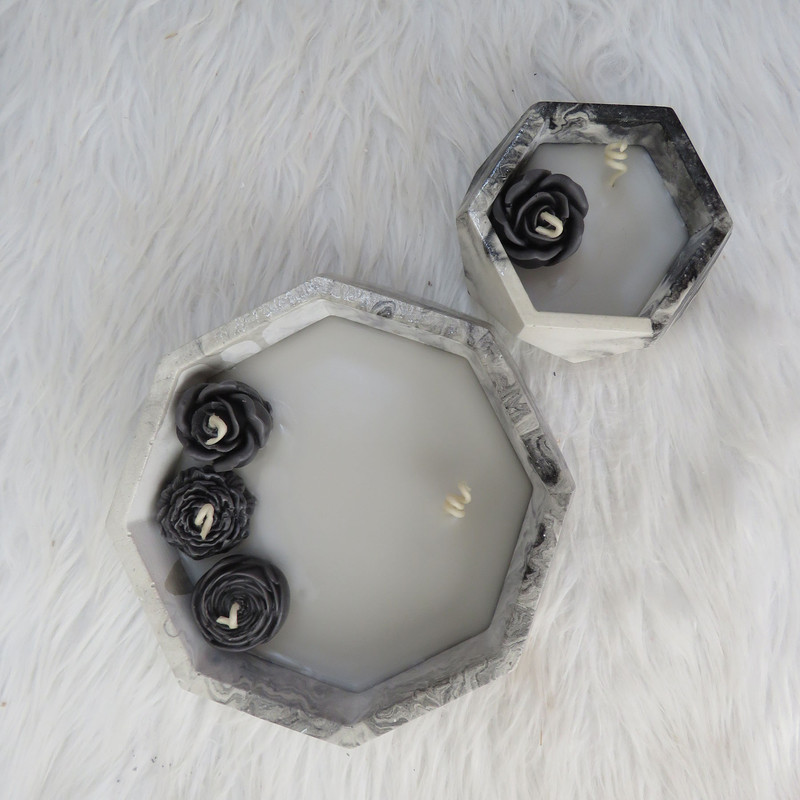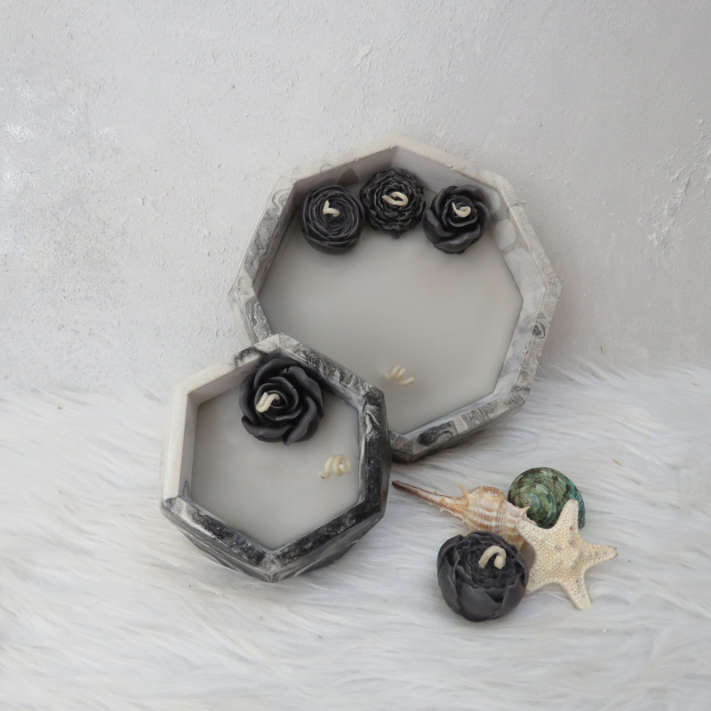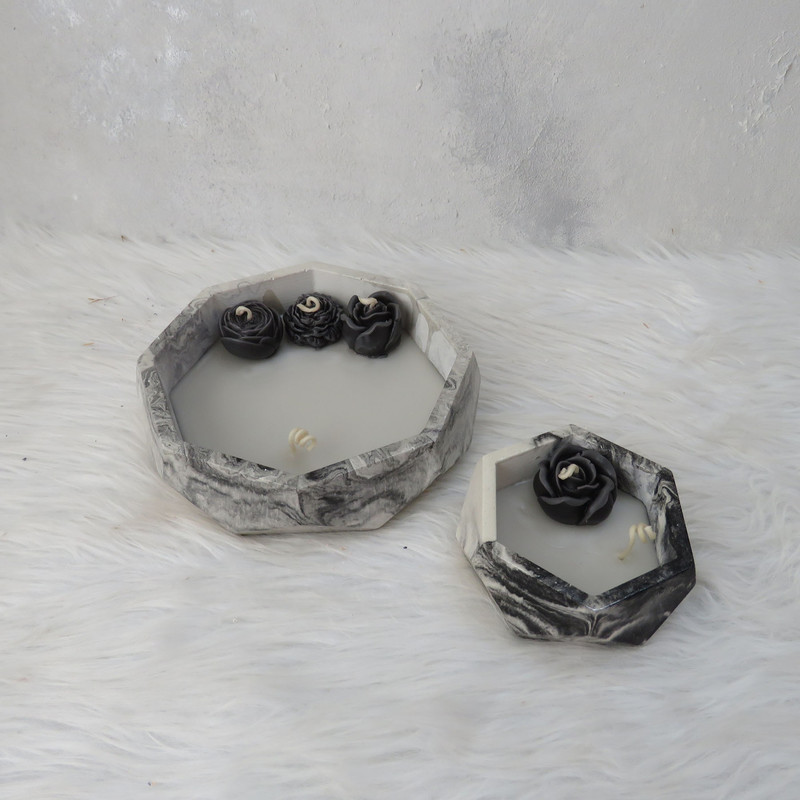 شمع دو تایی الین شامل دو عدد شات شمع با رز های مشکی است که برای دکوراسیون و استفاده روزمره مناسب است.شات بزرگ 16*16*5 و شات کوچکتر 10*10*4 است.این ست برای سرویس ها یا روی میز پذیرایی و میز غذاخوری مناسب و زیباست.