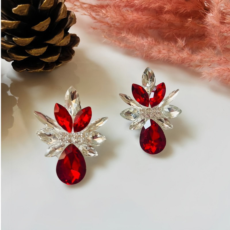 گوشوارهی کارمین با ترکیب چشمگیر نگینهای سرخِ عمیق و کریستالهای شفاف درخشان، جلوهای لوکس و تماشایی خلق کرده است. طراحی گلمانند آن با تراشهای دقیق و ظریف، نور را به شکلی خیرهکننده بازتاب میدهد و زیبایی آن را چند برابر میکند.