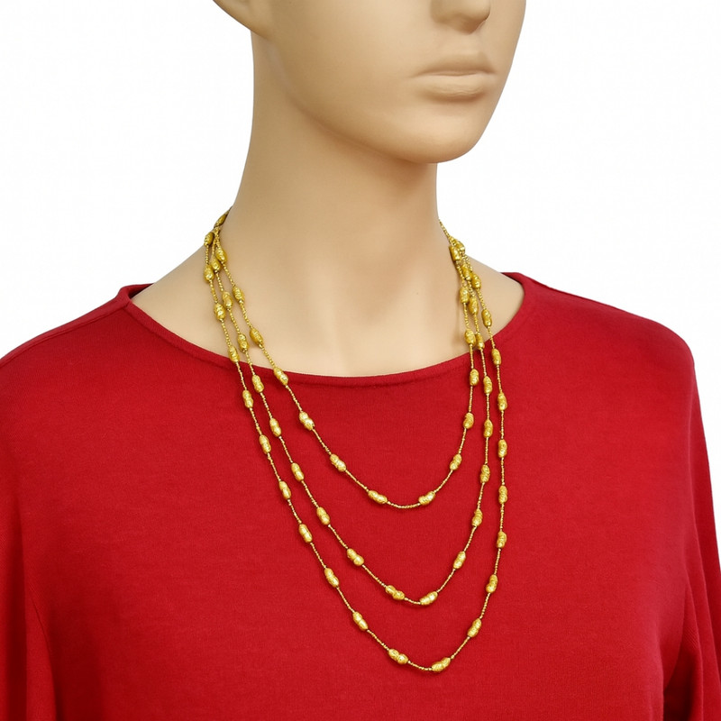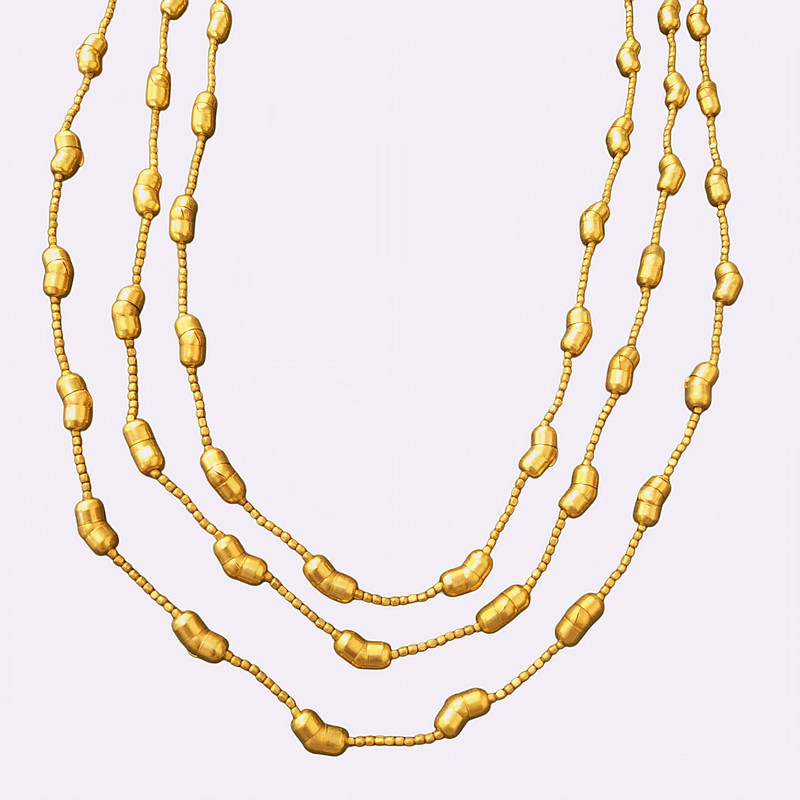 این گردنبند دست ساز با طراحی چندلایه و جزئیات ظریف، ترکیبی از ظرافت و قدرت بصری را به نمایش میگذارد. فرم مهرههای منظم در کنار زنجیر خوشساخت، جلوهای مدرن و لوکس ایجاد کرده که انتخابی ایدهآل برای استایلهای رسمی و نیمهرسمی است.