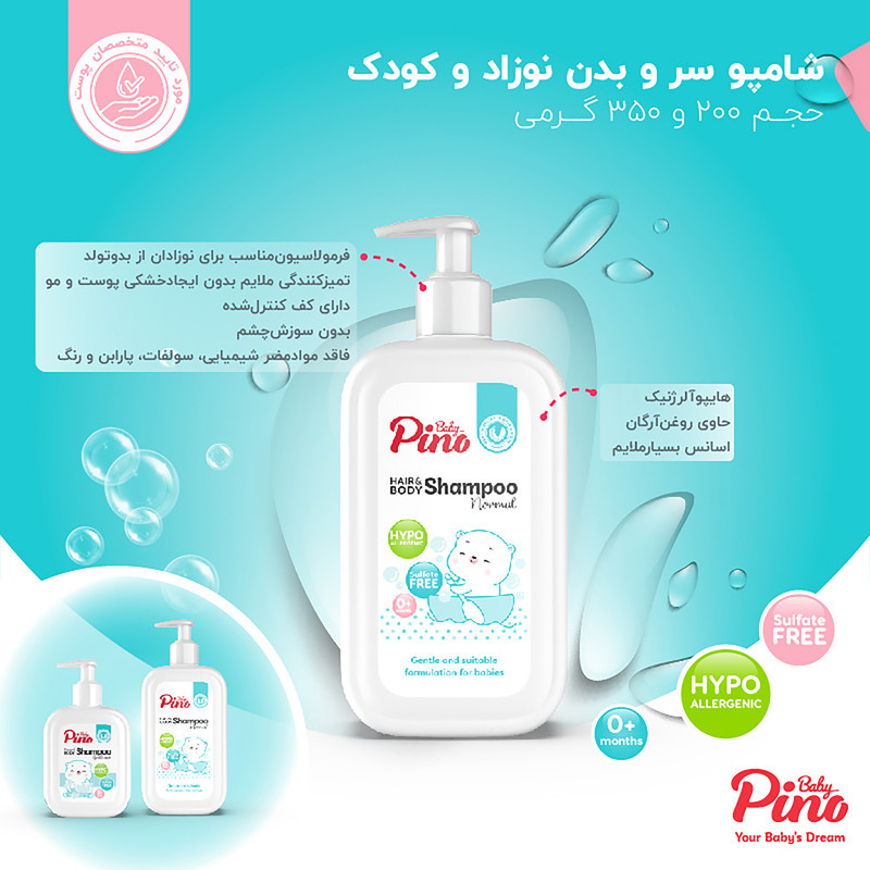 شامپو سر و بدن نوزاد و کودک پینو بیبی بسیار ملایم و مناسب برای نوزادان (از بدو تولد) و کودکان طراحی شده است. جهت جلوگیری از ایجاد هر گونه حساسیت و آسیب، ترکیبات محصول کاملا مطابق با پوست حساس نوزادان انتخاب و فرموله شده است. تمیزکنندگی ملایم شامپوها بدون ایجاد عارضهی خشکی، حفظ لطافت و نرمی مو و پوست را تضمین میکند. میزان کافی و اثرگذار روغن آرگان موجود در این محصول سبب ایجاد ویژگیهایی مثل آبرسانی و جلوگیری از ایجاد خشکی در اثر شستشو شده و در مجموع سبب تقویت و حفظ سلامت ساختار پوست کودک میشود. تمامی شامپوهای پینو بیبی با توجه به حساسیت پوست نوزادان تازه متولد شده و کودکان، فاقد مواد مضر شیمیایی مثل سولفات، پارابن و رنگ بوده و همچنین هنگام شستشو سبب ایجاد حساسیت و سوزش چشم کودک نمیشوند. در ساختار فرمولاسیون شامپوها از اسانسهایی کاملا هایپوآلرژنیک با رایحهای ملایم و دلپذیر استفاده شده که در کنار تمیزکنندگی مطلوبی که دارند، طراوت و شادابی را به پوست و موی نوزاد و کودک میبخشند. .