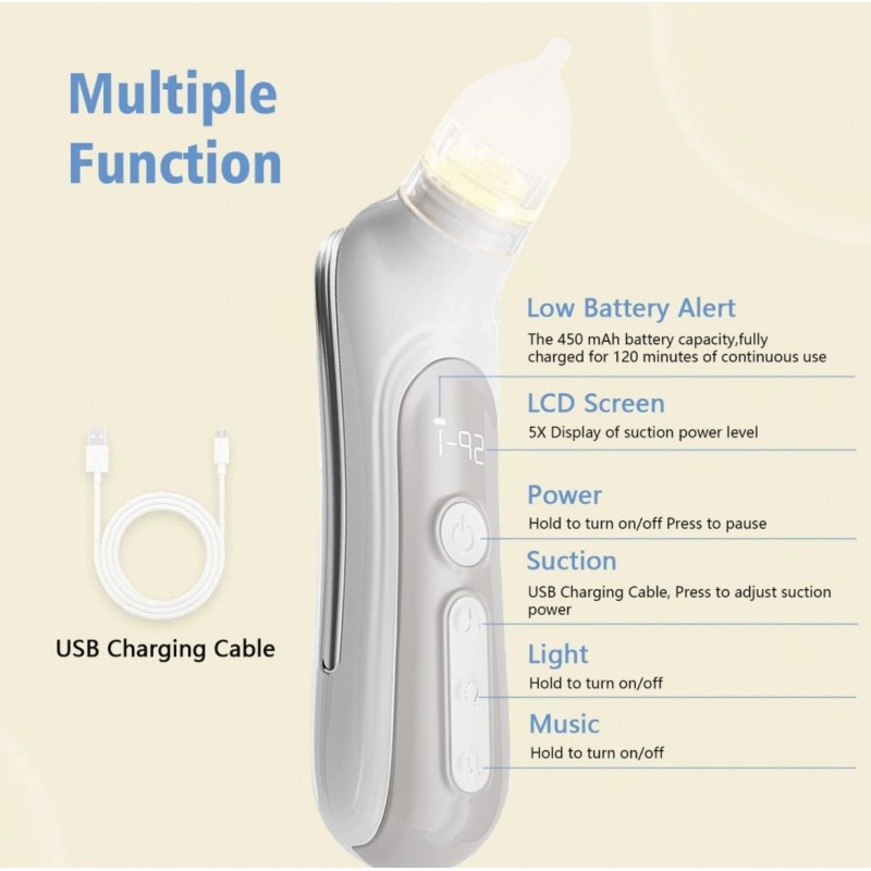 پوآر برقی بینی نوزاد ماماس پاپاس Mamas & papas دارای ٥ قدرت مکش مختلف به همراه موسیقی دلپذیر و جلوه های نوری می باشد, بطوریکه در زمان انجام مکش ، موزیک و نورهای رنگی متغییری پخش می شود و حواس کودک را به خود جلب میکند تا والدین بتوانند براحتی مخاط بینی را خارج کنند.دارای محفظه نگهدارنده محکم و بهداشتی, قابلیت شارژ شدن با شارژر دارای کابل Type_C درون جعبه دارای مخزن با قابلیت جداسازی و شستشوی آسان