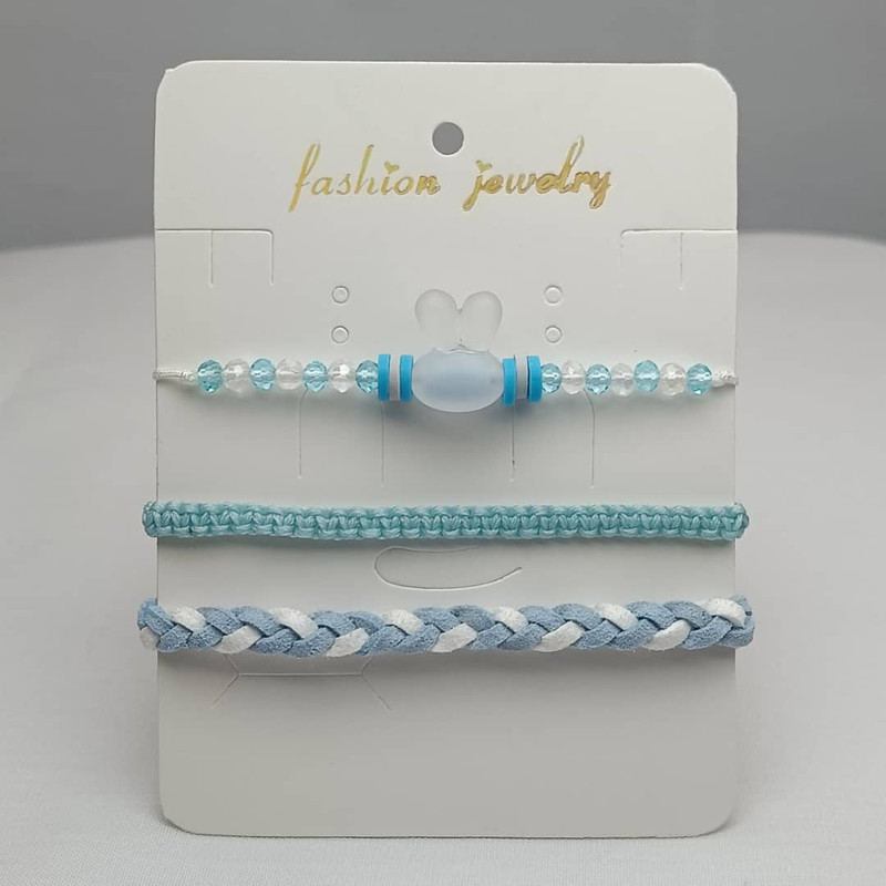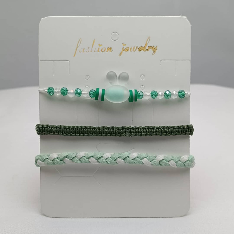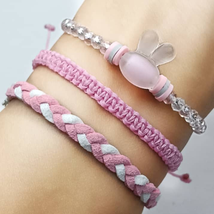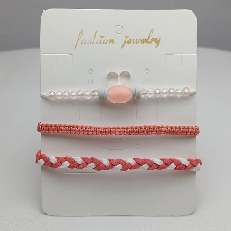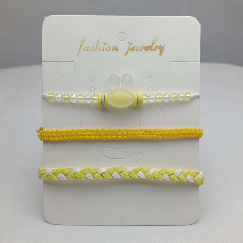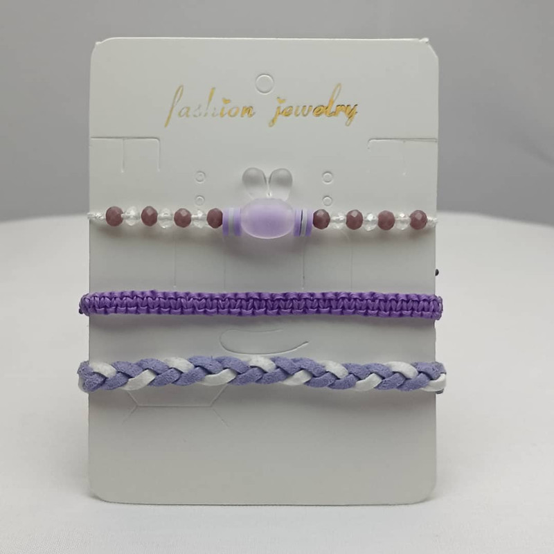 پک سه عددی دستبند دخترانه مناسب از سن 6 سال به بالا ، با بند کشویی قابل تنظیم در رنگهای متنوع است و به علت دست ساز بودن محصول جزو کارهای تک و خاص می باشد.جنس محصول از بافت اشبالت،نخ موم شده و مهرهای سنگی،فیمو و فلز .سایز تقریبی کامل دستبد باز شده 23 سانتی متر که با قفل کشویی قابل تنظیم میباشد.