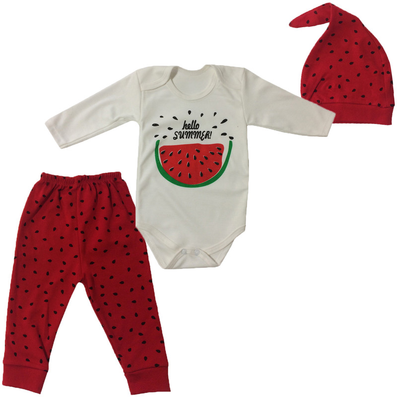 ست 3 تکه نوزادی تریکو طرح هندوانه مناسب برای نوزاد تا 1 سال می باشد.سه تکه شامل بلوز زیردکمه دار آستین بلند ، شلوار و کلاه پوم دار هست. این لباس مناسب برای استفاده در شب یلدا و سایر مناسبت ها می باشد.