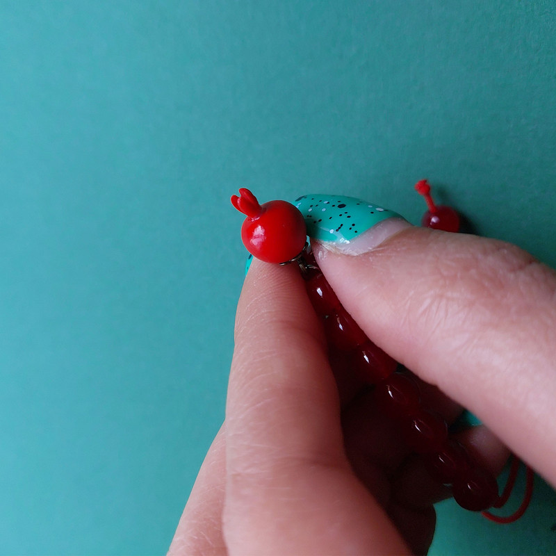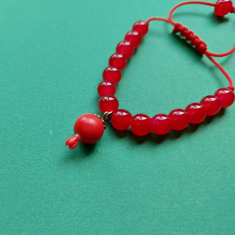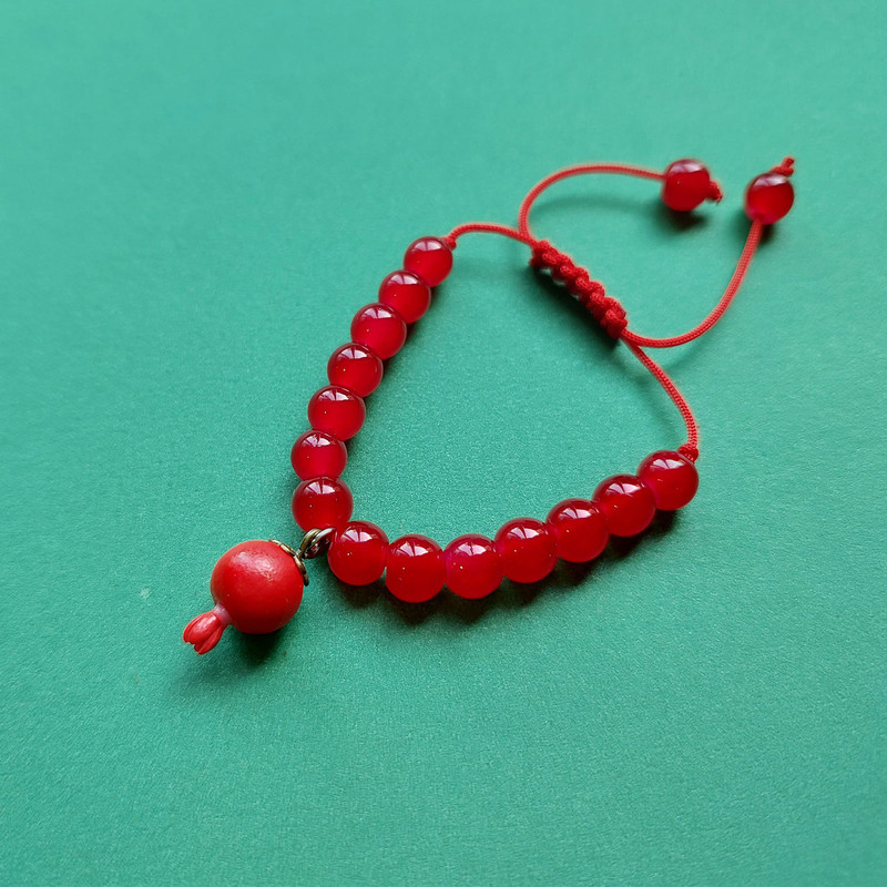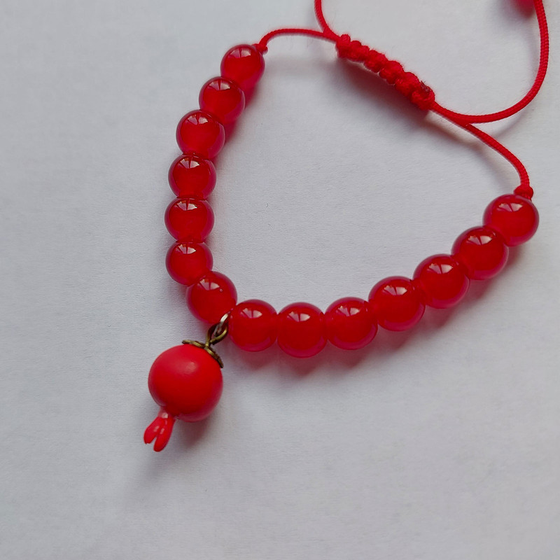 دستبند بچه گانه با سنگ های قرمز سایز 6 که دارای آویز اناری قرمز در وسط دستبند می باشد. نخ دستبند نیز قرمز رنگ است و دستبند به صورت گره کشویی باز و بسته می شود و بهترین گزینه برای دادن هدیه در شب یلدا است.