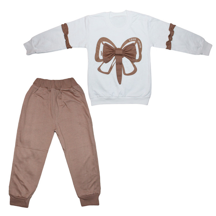 جنس پارچه بسیار نرم و لطیف و ضد حساسیت است . سویشرت و شلوار هر دو از جنس دورس هستند و مناسب فصل پاییز و زمستان است . پاپیون بر روی لباس دوخته شده است . رنگ لباس سفید و رنگ شلوار نسکافه ای می باشد .