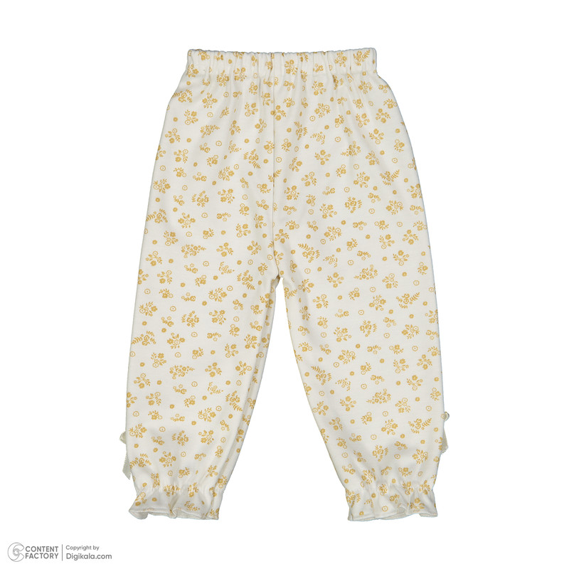 این شلوار نوزادی از پارچه پنبهای باکیفیت دوخته شده و با طرح گلهای ریز کرم روی زمینه سفید، کمر کشی نرم، چیندوزی ملایم و پاپیونهای کوچک در پاچهها، ظاهری لطیف و کاملاً کودکانه دارد.