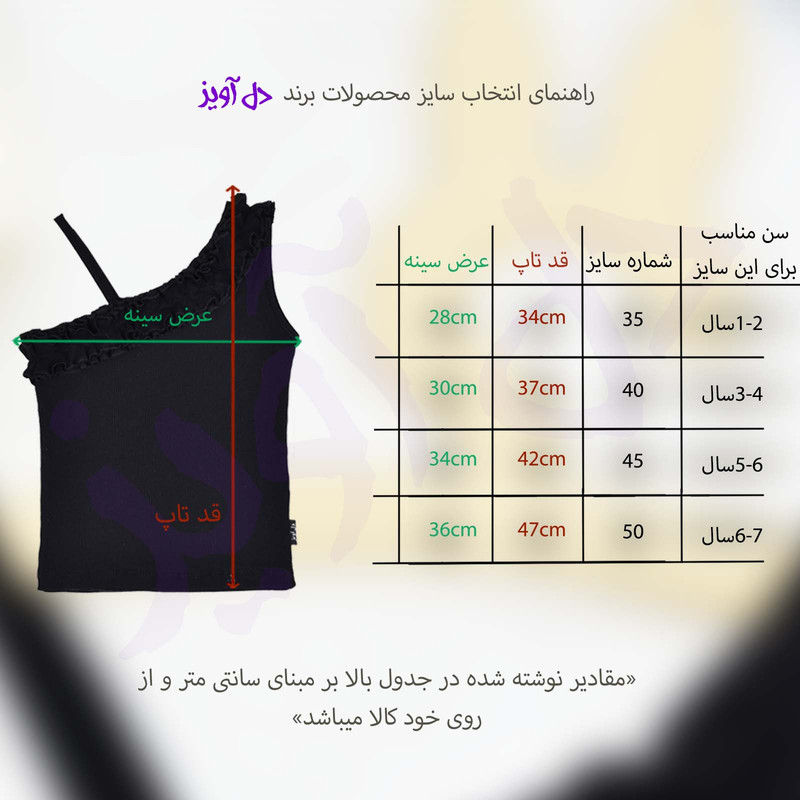 جزئیات : تاپ دخترانه مشکی با طرح یقه رومی چین دار با جنس پنبه صددرصد(بدون هیچ درصدی از مواد پلی استر) و بافت نرم