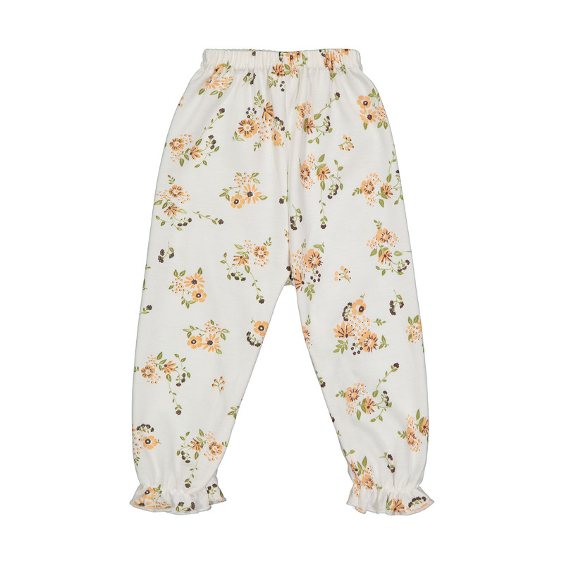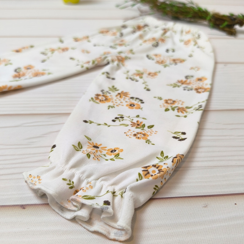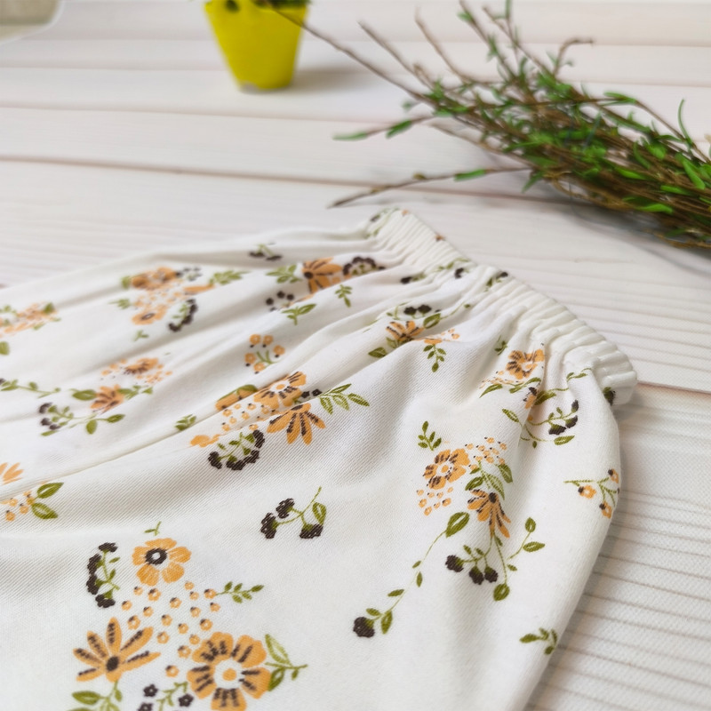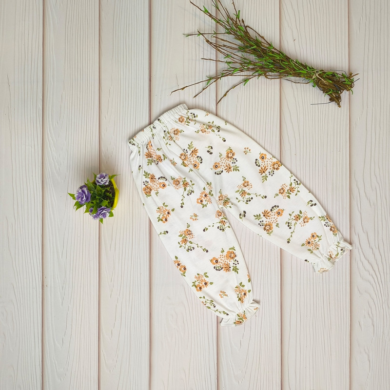 شلوار نوزادی با زمینه سفید و طرح گلهای ریز و رنگارنگ طراحی شده است. کمر آن کشی بوده و در قسمت مچها دارای چینخوردگی است که ظاهری زیبا و متفاوت به شلوار میبخشد. دوخت تمیز و جزئیات دقیق، ظاهر شلوار را جذاب و شیک کرده است.