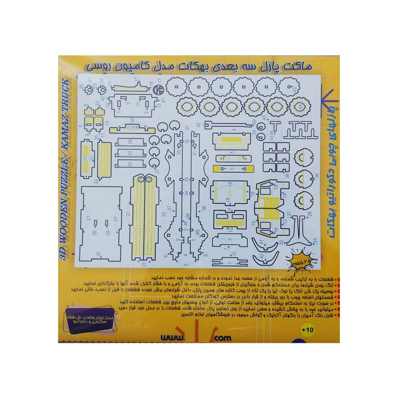 ماکت پازل سه بعدی کامیون روسی کاماز، از جنس چوب نازک و بسیار سبک با 68 قطعه چوبی ظریف که همگی بر روی یک صفحه قرار گرفته، میتواند تا بیش از یک ساعت، علاقه مندان به پازل و ساختنی ها را سرگرم و مجذوب خود نماید. مشتاقان این گونه سرگرمی میبایست با ظرافت و حوصله، تمامی قطعات را به ترتیب شماره های درج شده بر روی راهنمای تمام رنگی مقوایی همراه آن، بدون نیاز به وارد آوردن فشار، به آرامی جدا کرده و در محلهای مربوط به خود نصب نمایند. در زمان جا دادن قطعات در سوراخهای پیش بینی شده حتما سعی شود با دقت و با اندکی فشار کنترل شده، قطعه را نصب نمایید. تنگ بودن بعضی از شیارهای تعبیه شده، به جهت بالا بردن استحکام نهایی ماکت بوده و نتیجه کار را بسیار مطلوبتر خواهد نمود. این ماکت پازل، ساخت بهکات با بهترین کیفیت و همچنین با هدف سهولت در خرید برای همه اقشار با هر سطح توانایی مالی، با مناسبترین قیمت ممکن تقدیم علاقه مندان گردیده. این سرگرمی، بعد از ساخت، همزمان بعنوان یک دکوری تزیینی جذاب، زینت بخش میز و اتاق منزل و محل کار خواهد بود. و همچنین ماکت پازلهای 3 بعدی چوبی بعنوان یک سرگرمی فکری نیز برای کودکان و بزرگسالان بسیار مناسب بوده و توانایی نقشه خوانی و مهارت کار با دست را ارتقا میبخشد.