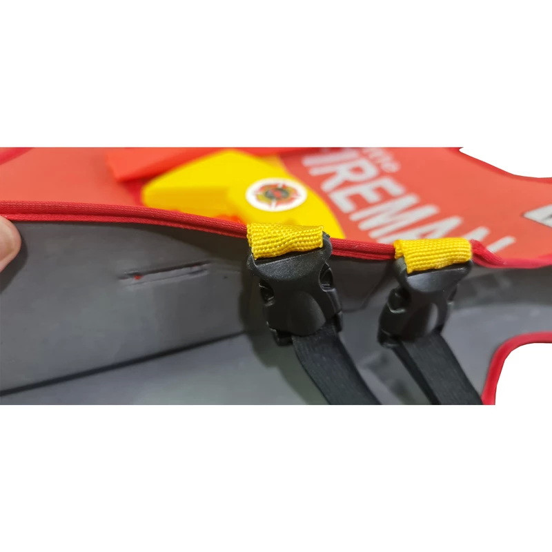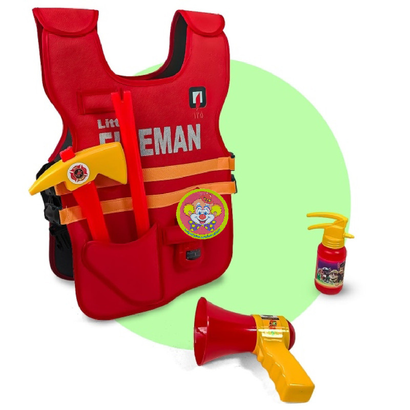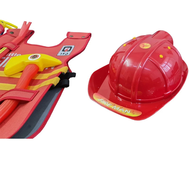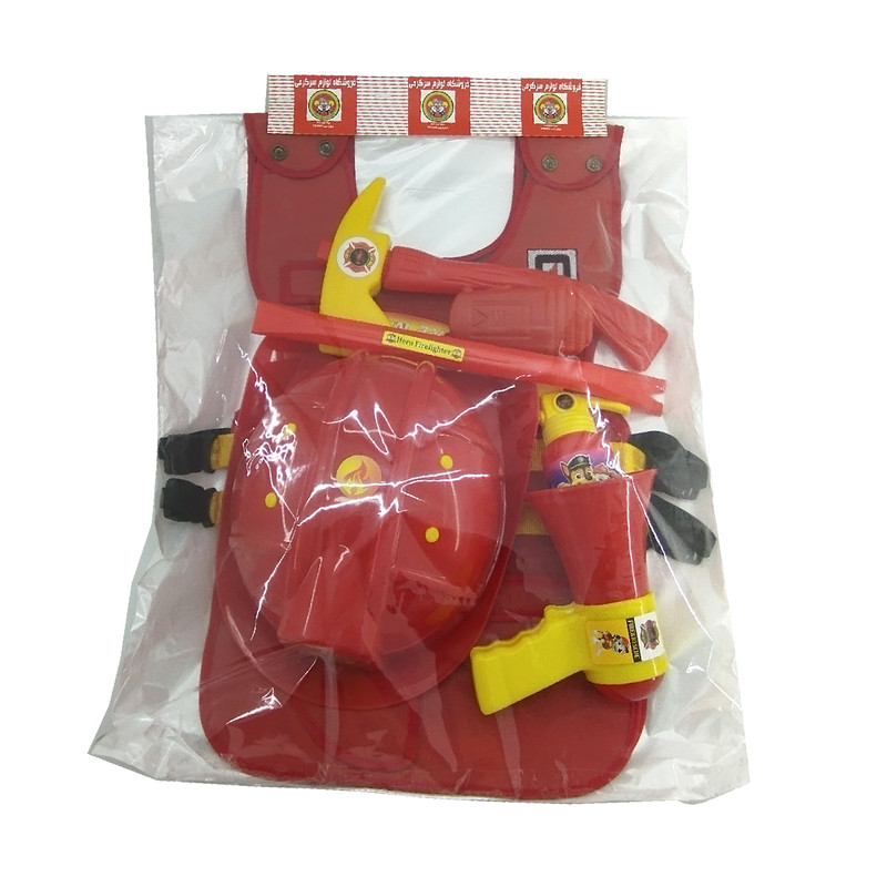 ست ایفای نقش آتش نشان کوچک شامل جلیقه ضد حریق آتش نشانی ( فری سایز ) - کلاه - تبر - دیلم - بلند گو - گوشی بی سیم - و اسپری دستی میباشد.