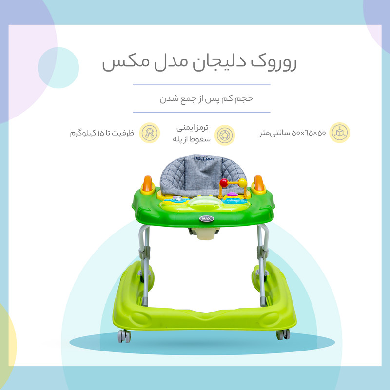 - قابل استفاده از 6 ماهگی - کنسول موزیکال - تنظیم ارتفاع در سه حالت - حجم کم پس از جمع شدن - ترمز ایمنی سقوط از پله - استفاده به عنوان والکر - قابل شستشو - قابلیت تنظیم سه حالته - جنس بدنه: پلاستیک