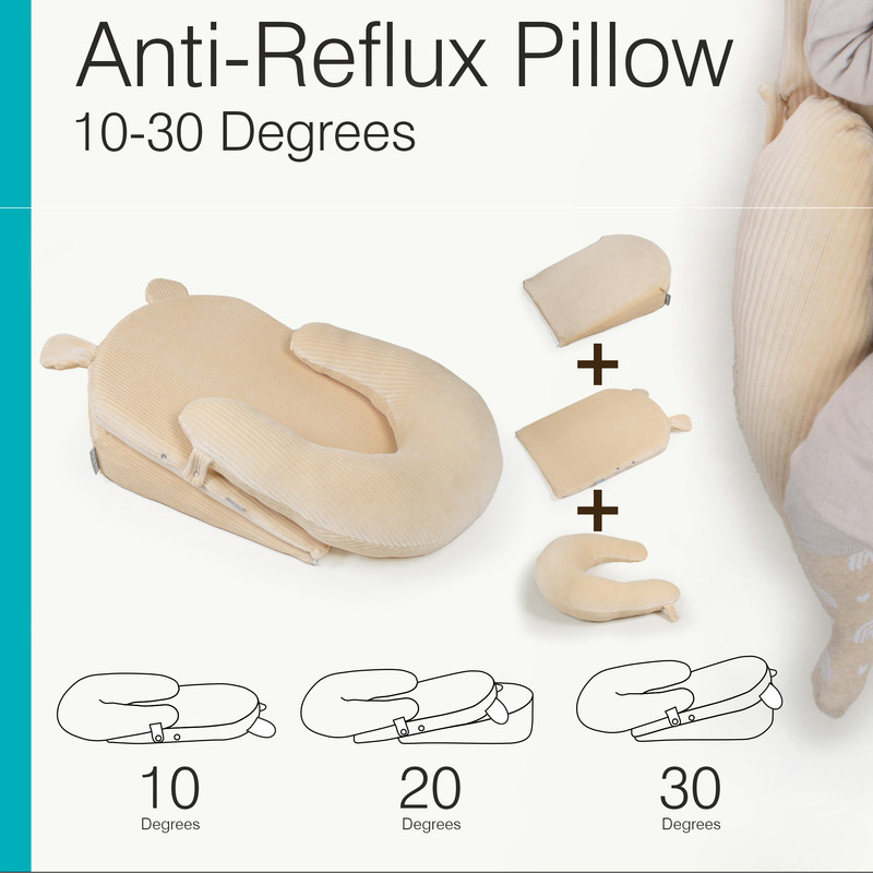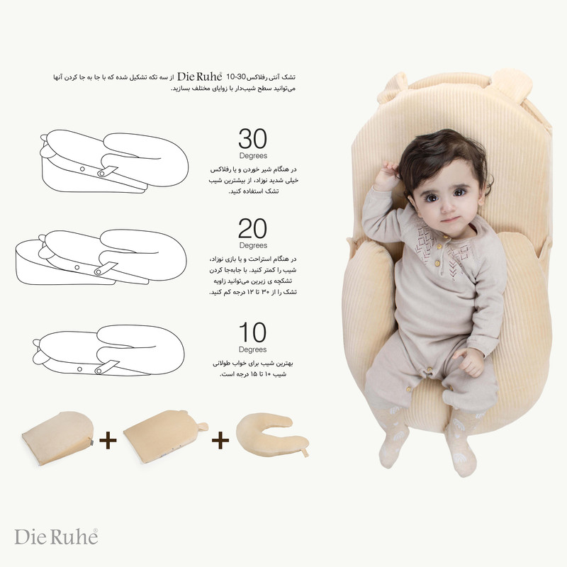 برگشت محتویات معده به مِری و دهان، رفلاکس نامیده می شود. اکثر نوزادان در ماه های ابتدایی زندگی خود، رفلاکس را تجربه می کنند و به مرور و با بزرگتر شدن نوزاد، رفلاکس برطرف می شود. رفلاکس نوزاد می تواند باعث بی قراری نوزاد در روز، و بی خوابی و ناآرامی او در شب شود. قرار دادن نوزاد بر روی سطح شیب دار به صورت چشمگیری در کاهش رفلاکس موثر است. تشک آنتی رفلاکس 30-10 دیروحه از سه تکه مجزا تشکیل شده است که با جا به جا کردن آنها می توانید سطح شیبدار با زاویه های مختلف داشته باشید. روکش تشک از جنس مخمل صد در صد پنبه و قابل شستشو می باشد. در هنگام شیرخوردن و یا رفلاکس خیلی شدید نوزاد، از شیب سی درجه استفاده کنید. در هنگام استراحت و یا بازی کودک شیب را کمتر کنید. با جا به جا کردن تشکچه ی زیرین می توانید شیب را از سی تا دوازده درجه کم کنید. بهترین شیب برای خواب طولانی کودک، شیب ده تا 15 درجه است.