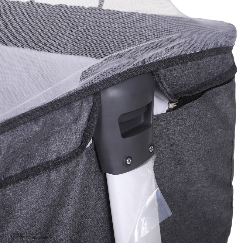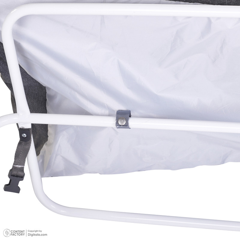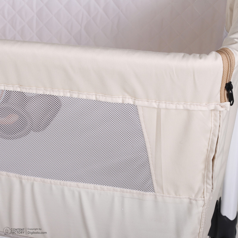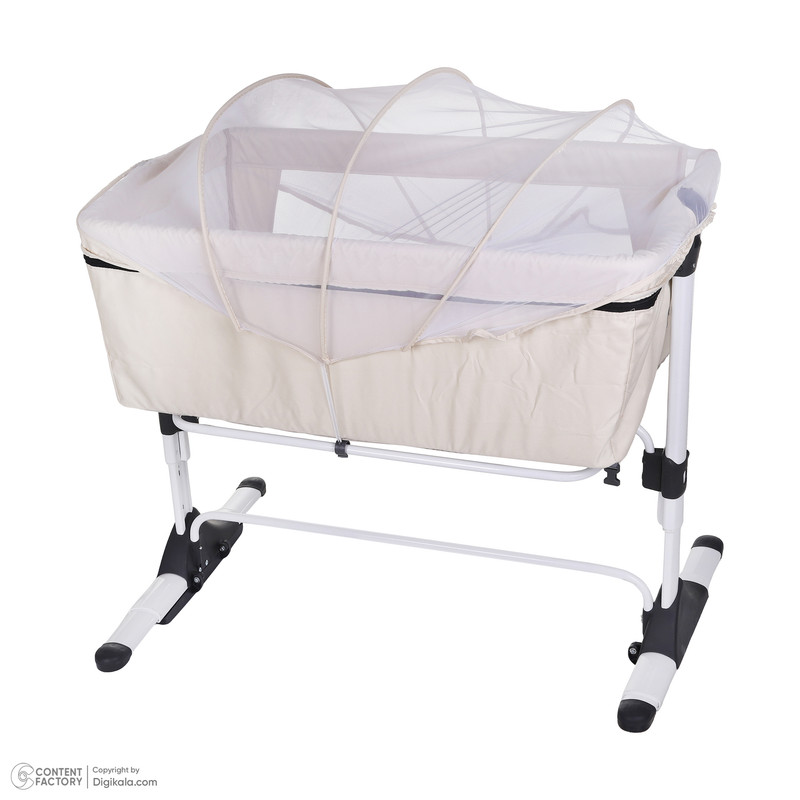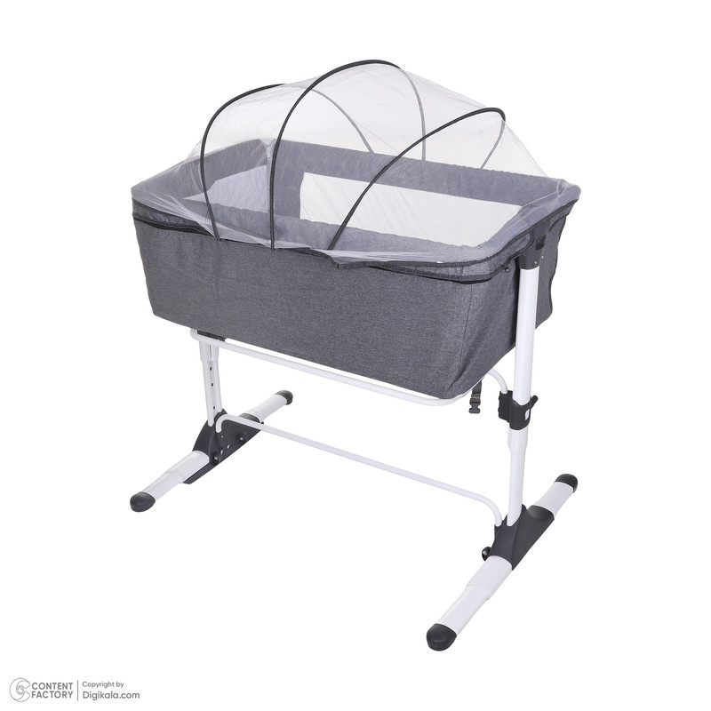 سایر توضیحات : - دارای کمربند اتصال به تخت مادر جهت جلوگیری از افتادن کودک - پایه‌ها با قابلیت تبدیل شدن به گهواره - دارای دستگیره‌های تنظیم ارتفاع - پارچه داخل راشل و تترون 3 لایه ضد تعریق و ضد حساسیت - دارای پشه بند