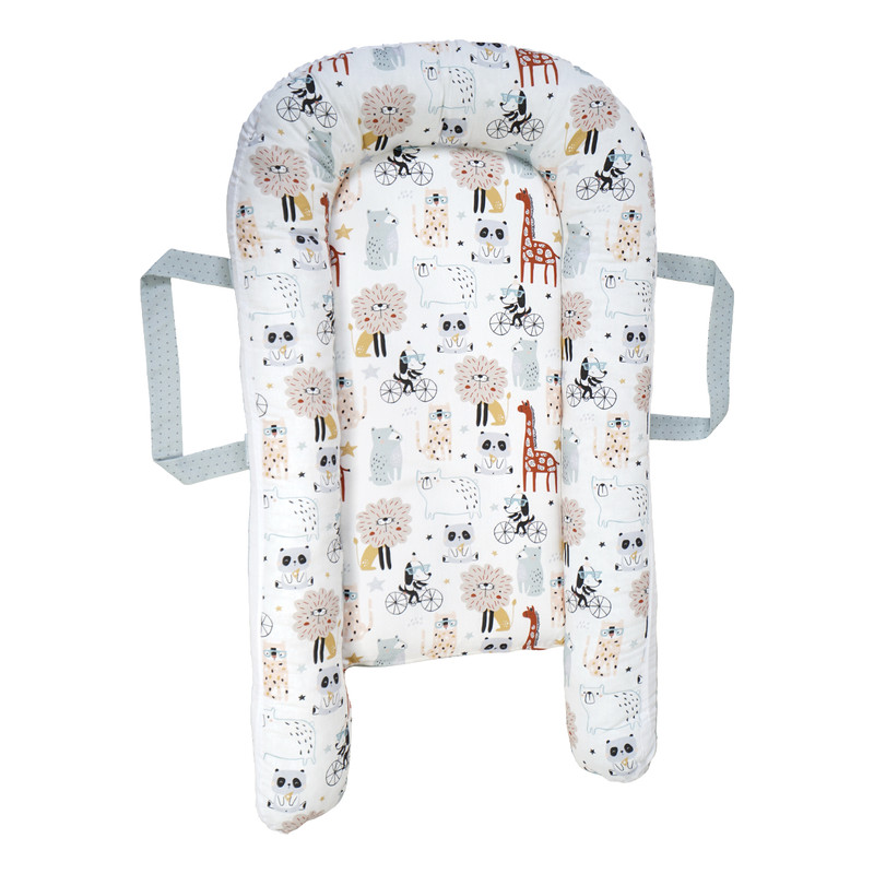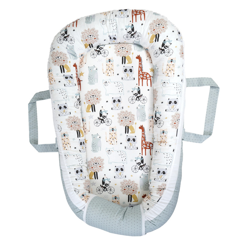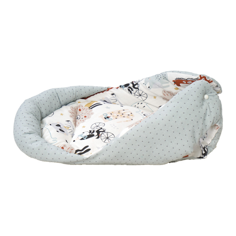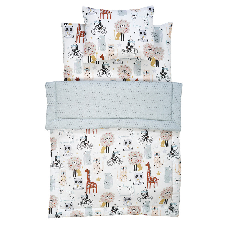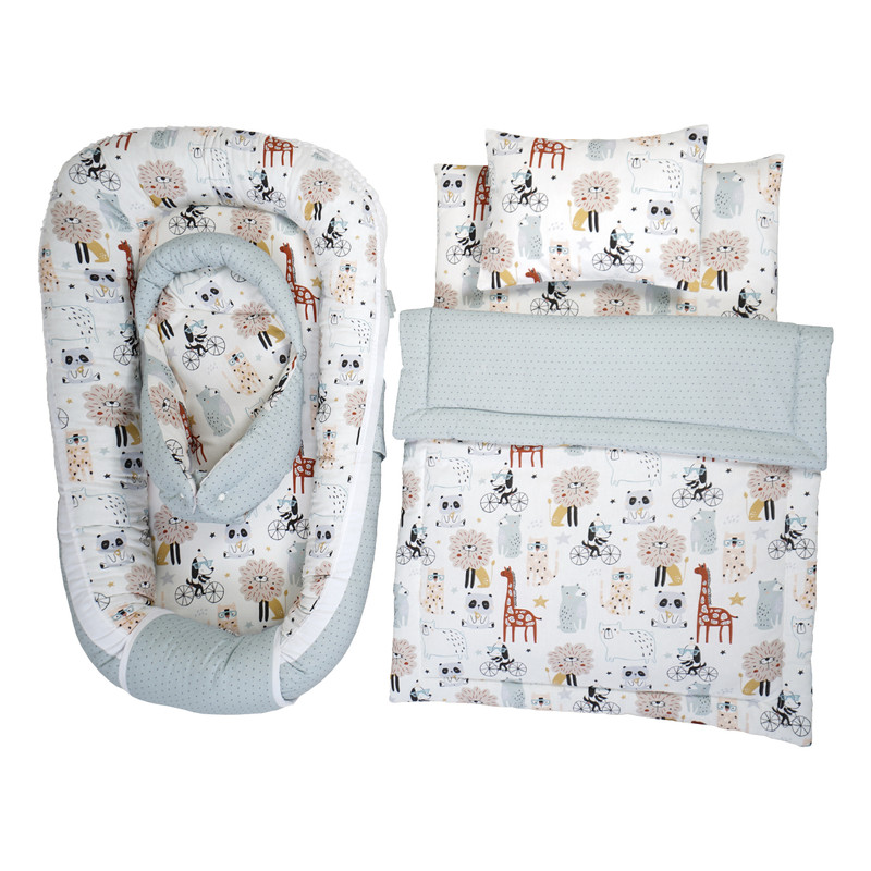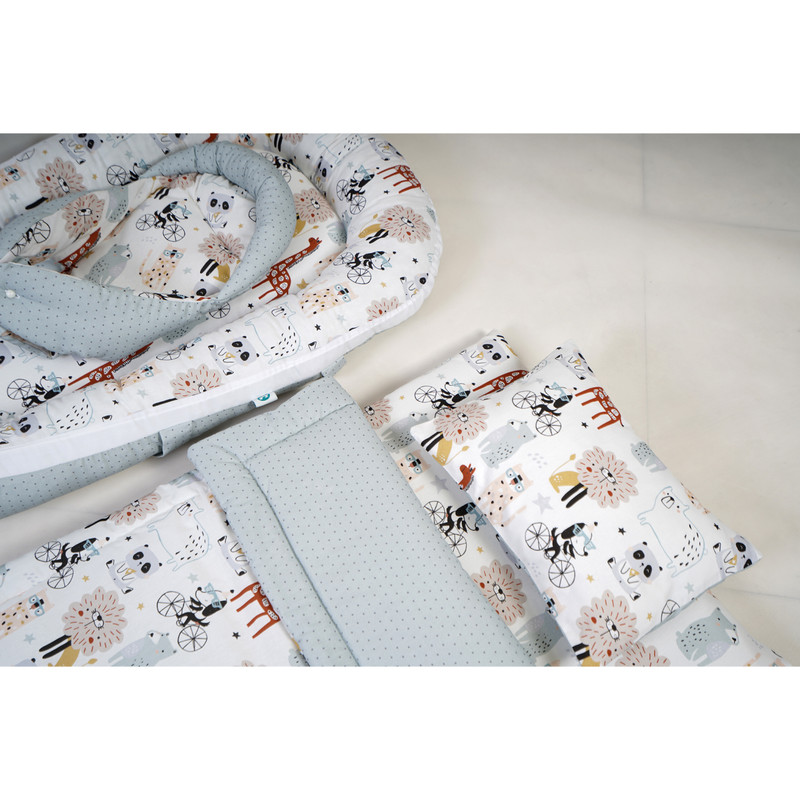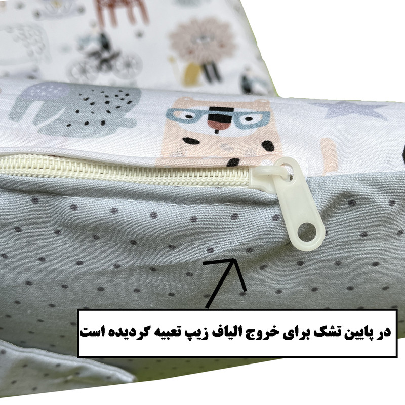 این سرویس پنج تکه شامل یک تشک لبه دار، آغوشی (قنداق سوئیسی) و سرویس کامل دم دستی می باشد. پارچه استفاده شده در این محصول کتان 100درصد پنبه است و هیچ گونه حساسیتی برای نوزاد شما ایجاد نخواهد کرد. در سرویس های خواب نوزادی بعد از حساسیت زا نبودن پارچه که یکی از مهم ترین فاکتورها برای انتخاب است، قابل شست و شو بودن پارچه نیز بسیار حایز اهمیت است. بالش و همینطور هر دو تشک این مجموعه قابلیت خارج کردن الیاف را داشته و با اطمینان از تثبیت رنگ محصول، می توانید رویه ی آنها را با دست و یا ماشین لباس شویی بشویید.