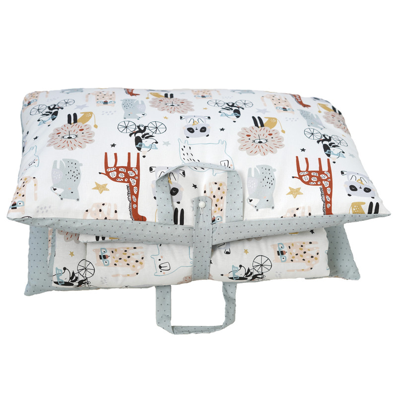 ابعاد تشک لبه دار ۹۴x۷۳x۱۰ - ابعاد تشک دم دستی ۵x۶۲x۸۸ - ابعاد پتو ۹۸x۷۶x۱.۵ - ابعاد بالش ۴۰x۳۰x۵ - هر دو روی محصول پارچه کتان ۱۰۰درصد پنبه با کیفیت فوق العاده بالا و بسیار لطیف و چاپ ثابت