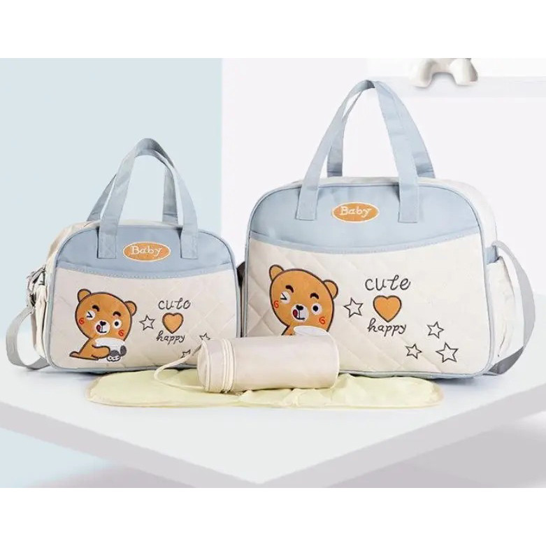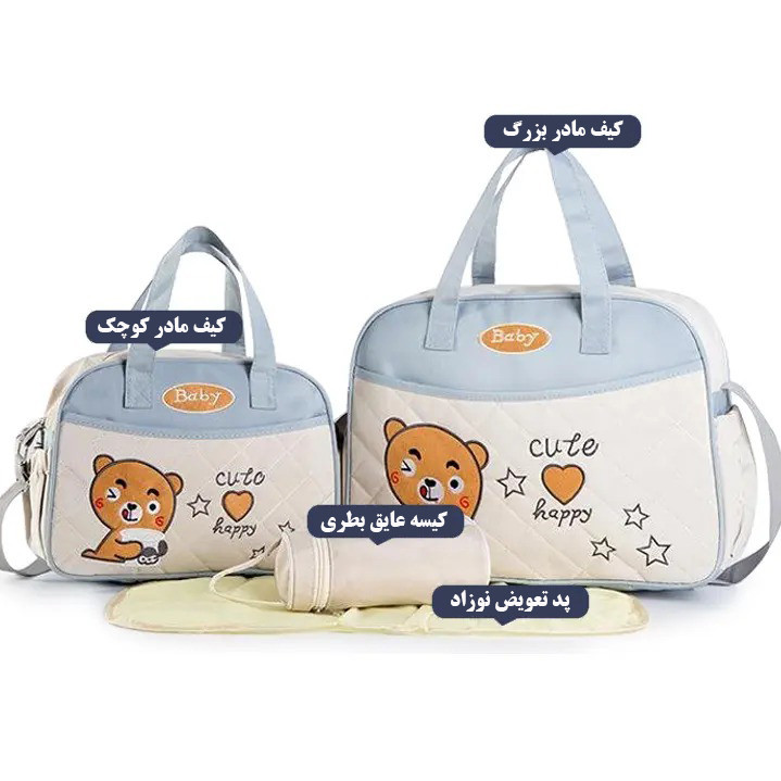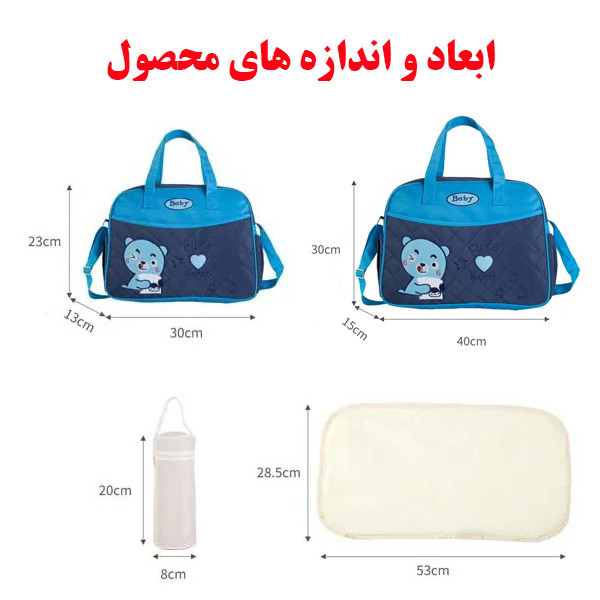 ساک لوازم یکی از مهم ترین اقلام در خرید سیسمونی میباشد.همچنین به دلیل این که بیشترین استفاده را نیز در اقلام سیسمونی دارد باید در خرید یک ساک لوازم جا دار ، با کیفیت و همینطور کاربردی دقت لازم را داشت. ساک لوازمی که در تصویر مشاهده میکنید شامل یک کیف بزرگ، یک کیف متوسط، کیف عایق بطری و یک پد تعویض نوزاد است. لذا شما می توانید برای سفرها و مهمانی های نزدیک و کوتاه از ساک کوچک و در سفرهای بلند مدت از ساک بزرگ و یا هر دو استفاده کنید.